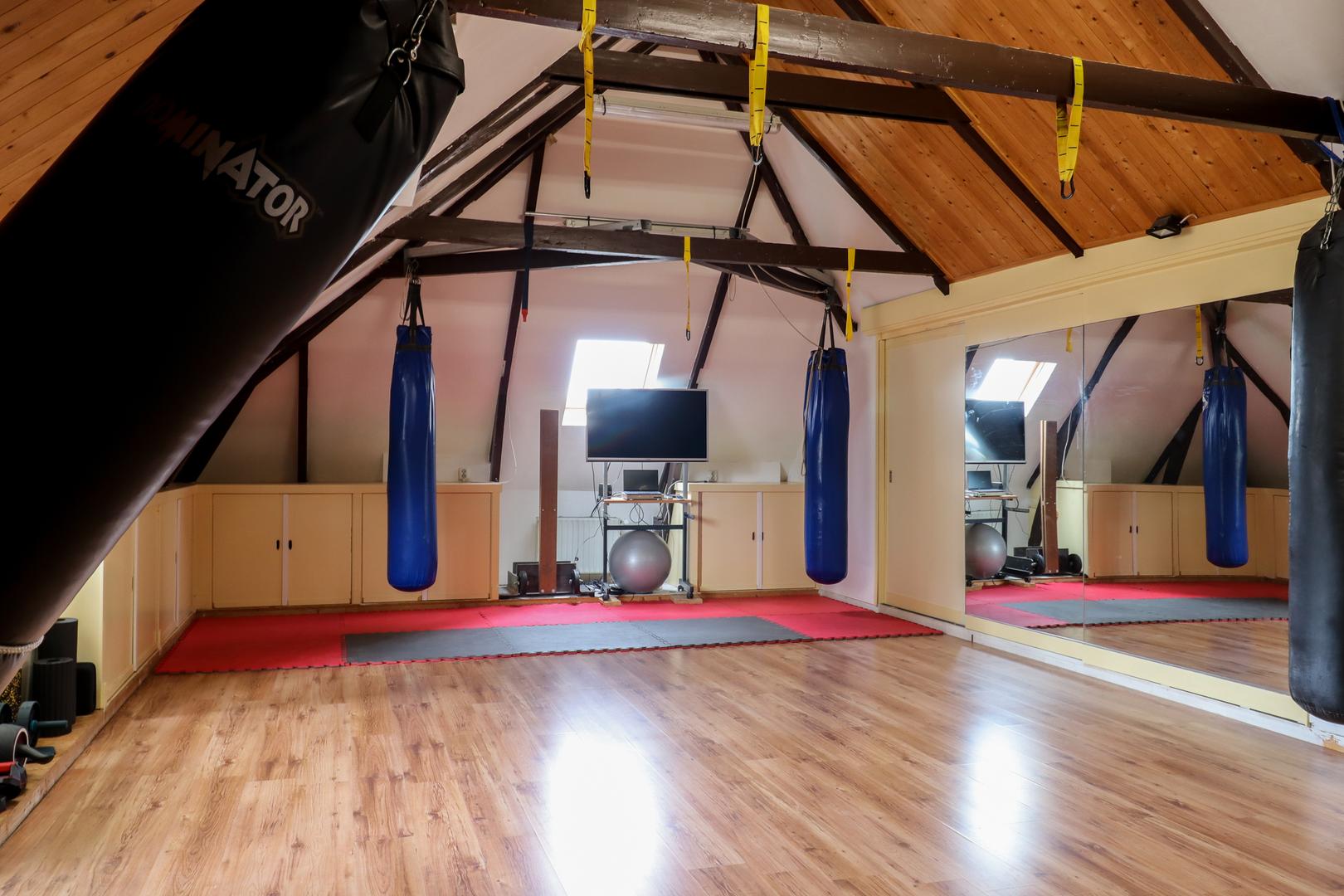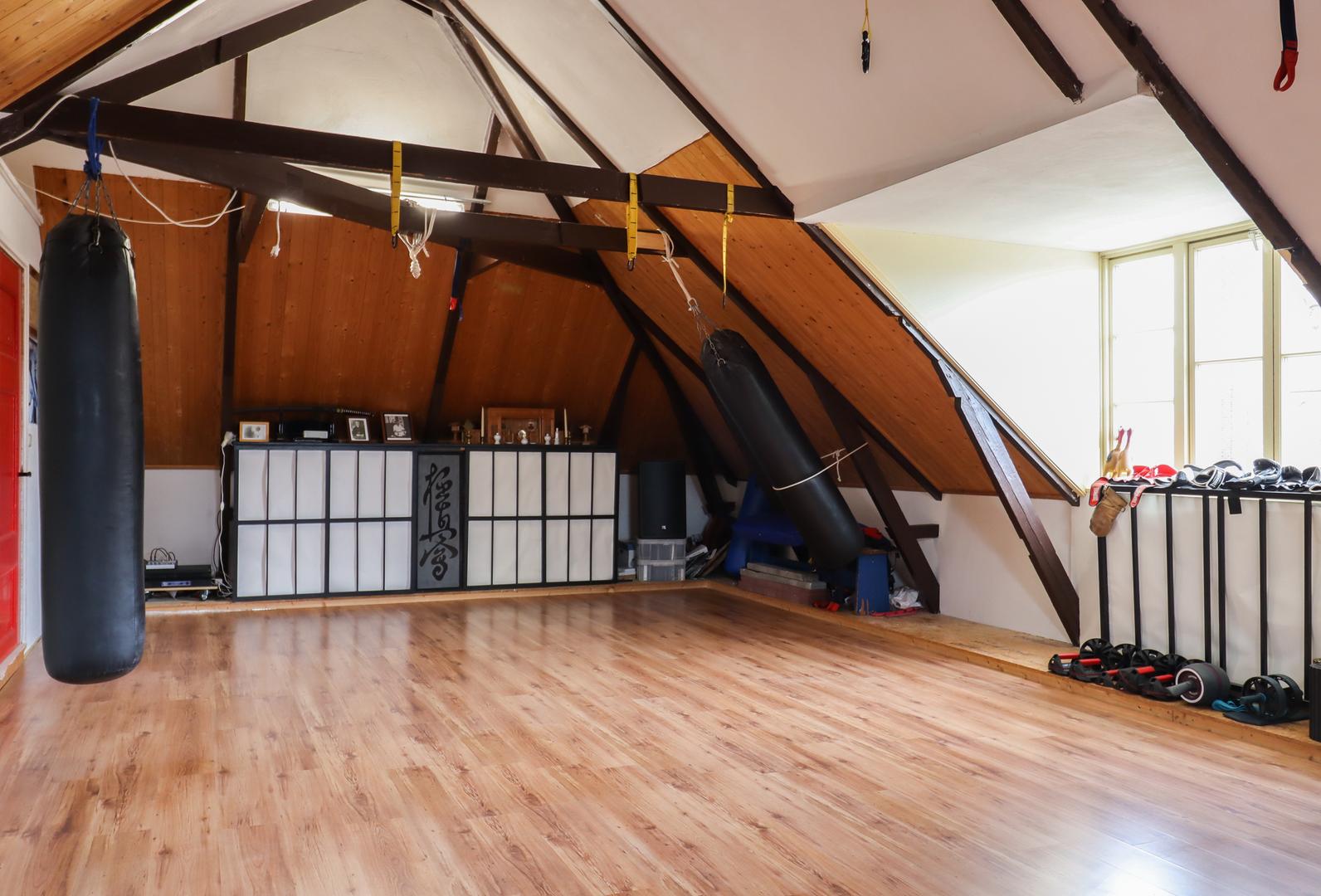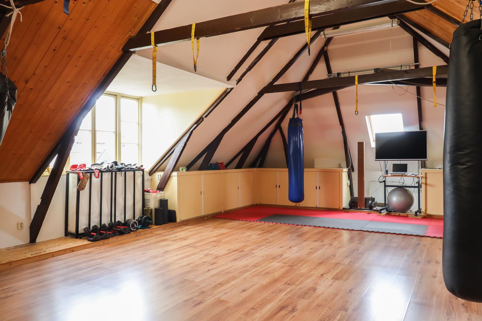 Ook de tweede verdieping biedt een overvloed aan ruimte. Hier bevindt zich een zeer grote multifunctionele ruimte, momenteel in gebruik als sportzaal, maar geschikt voor uiteenlopende doeleinden zoals atelier, studio of extra woonruimte. Daarnaast is er een ruime slaapkamer met eigen badkamer (douche en wastafel) en een separaat toilet op de overloop.