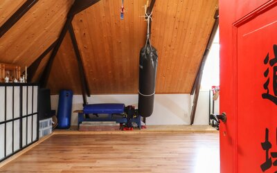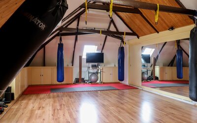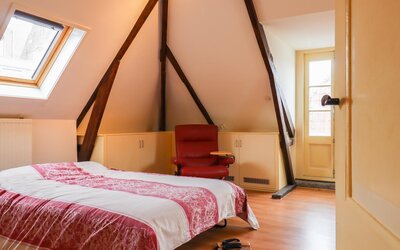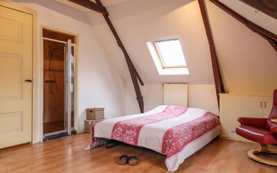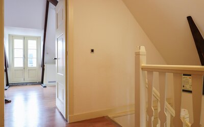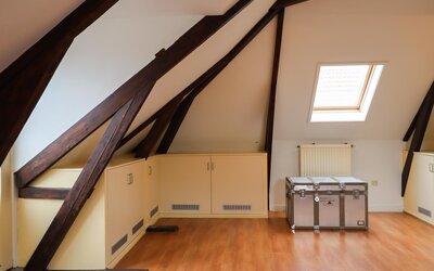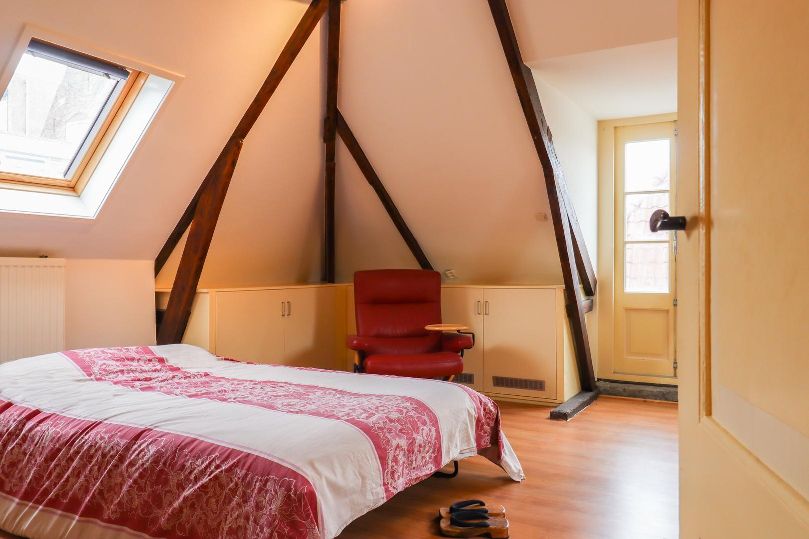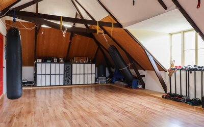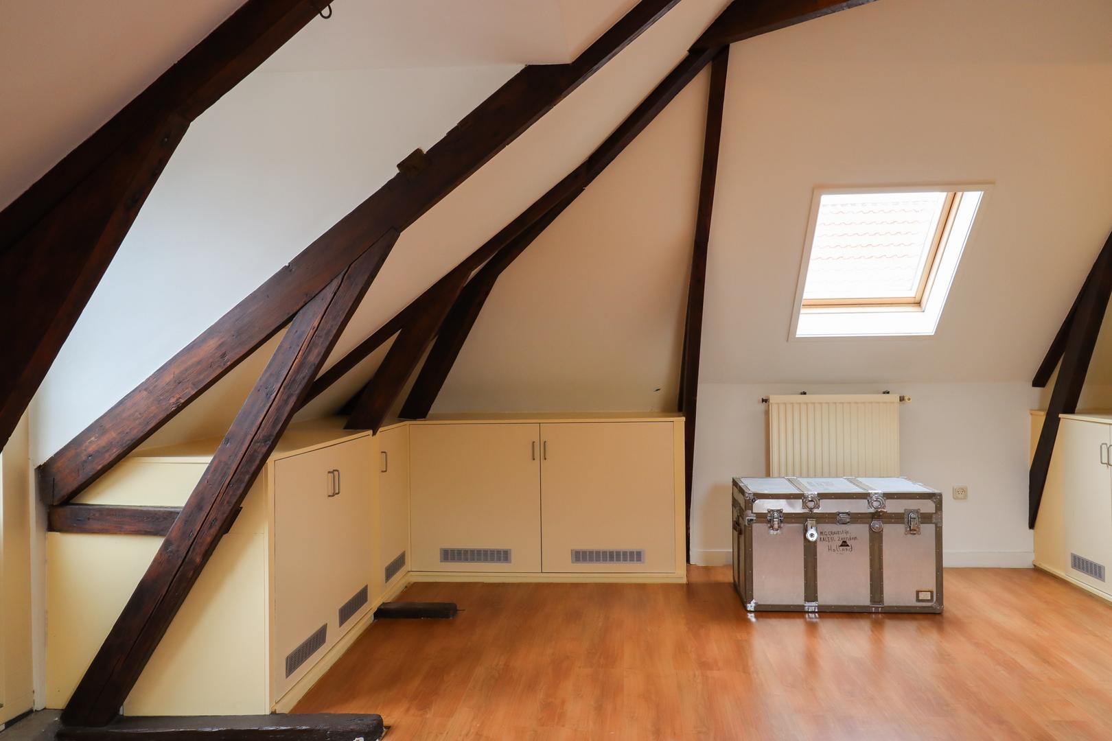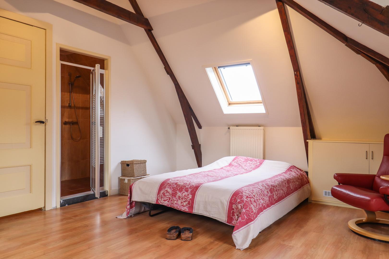 Ook de tweede verdieping biedt een overvloed aan ruimte. Hier bevindt zich een zeer grote multifunctionele ruimte, momenteel in gebruik als sportzaal, maar geschikt voor uiteenlopende doeleinden zoals atelier, studio of extra woonruimte. Daarnaast is er een ruime slaapkamer met eigen badkamer (douche en wastafel) en een separaat toilet op de overloop.