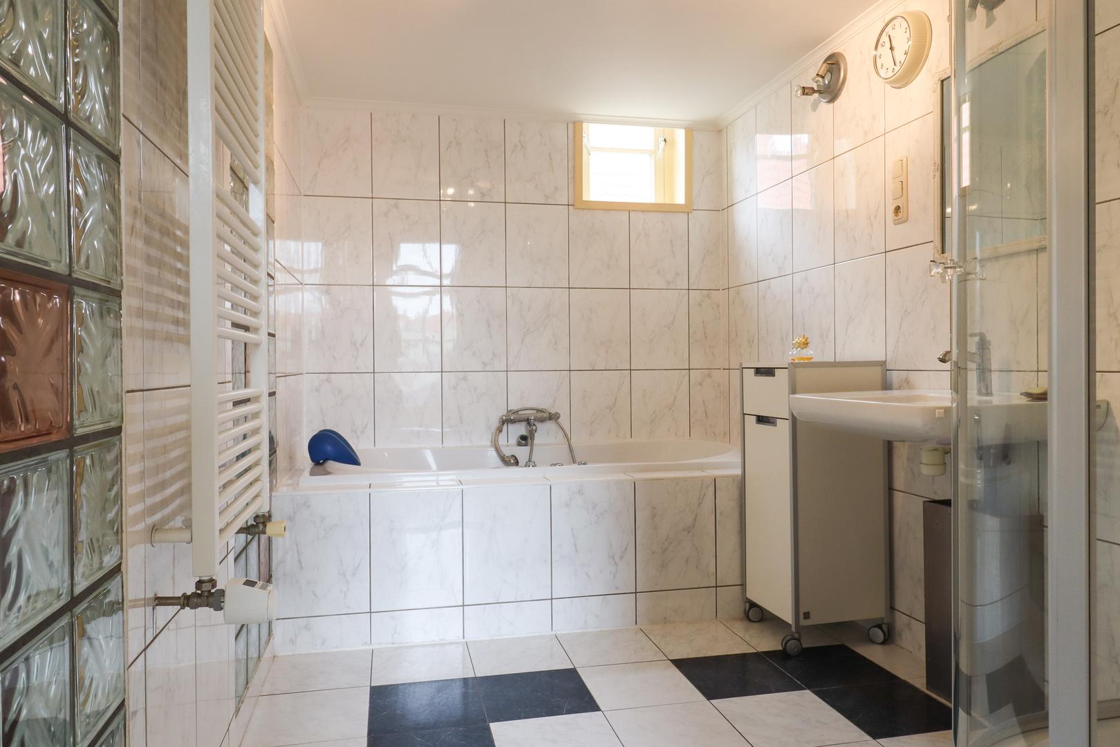 Op de eerste verdieping bevindt zich een royale woonkamer van circa 48 m², een ruime separate keuken, de master bedroom, een toilet en een complete badkamer voorzien van ligbad, douche en wastafel. De ruimtes kenmerken zich door hun omvang, lichtinval en prettige indeling.