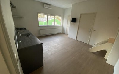 De verdiepingsvloer is bereikbaar door middel van een vaste trap. Op deze verdiepingsvloer zijn drietal ruimtes met keuken, toiletruimte met fontein, en kantoorruimtes. Deze worden verwarmt doormiddel CV.