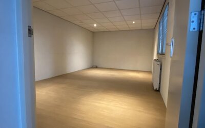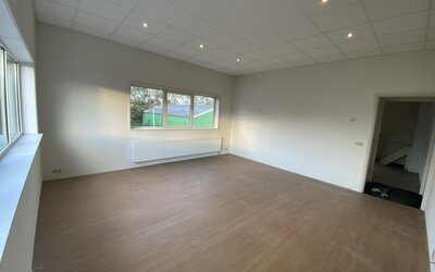 De verdiepingsvloer is bereikbaar door middel van een vaste trap. Op deze verdiepingsvloer zijn drietal ruimtes met keuken, toiletruimte met fontein, en kantoorruimtes. Deze worden verwarmt doormiddel CV.