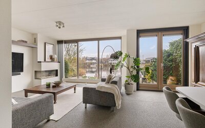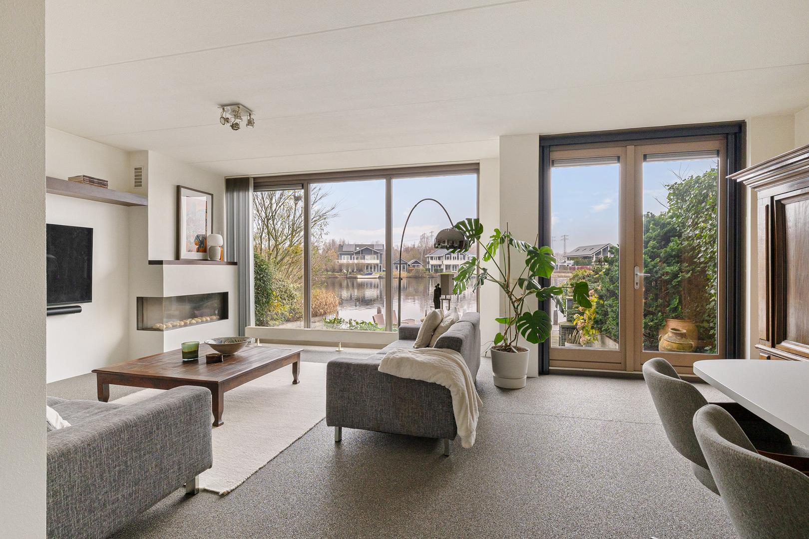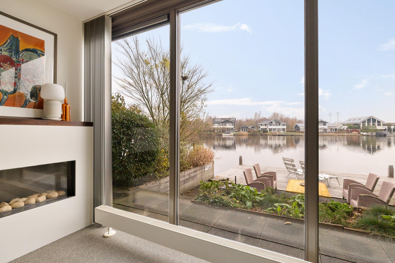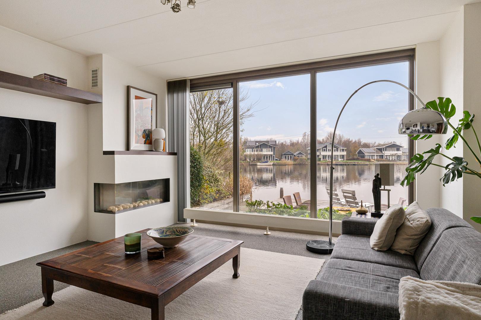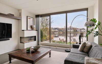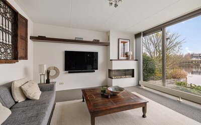 Via de overkapping bereik je de voordeur en stap je binnen in een lichte hal. Vanuit deze entree bereik je de trap naar boven en heb je toegang tot het toilet, de meterkast en een vaste kast. De royale woonkamer strekt zich uit over de volledige achterzijde van de woning, met een brede glazen pui die het uitzicht naar de tuin en het water prachtig omlijst. De zithoek bij de sfeervolle gashaard voelt warm en ruim aan, terwijl een elektrisch zonnescherm zorgt voor comfort op zonnige dagen. Aan de voorzijde vind je de indrukwekkende leefkeuken, uitgevoerd met een luxe kookeiland en een kastenwand die is voorzien van hoogwaardige inbouwapparatuur, waaronder een stoomoven, combioven, hoge koelkast, hoge vriezer, Quooker en diverse apparatuur van Miele. De inductieplaat werd vernieuwd in 2023 en de grindvloer in de keuken is geseald. Dankzij deze moderniseringen voelt de keuken als nieuw. Vanuit de keuken heb je directe toegang naar buiten en naar de garage. De garage is uitgevoerd met een geïsoleerde muur, wat deze ruimte extra bruikbaar maakt.