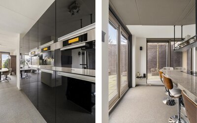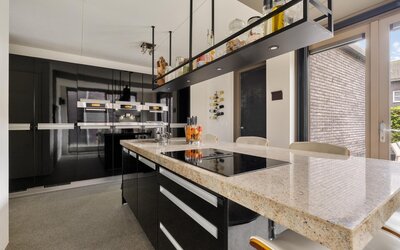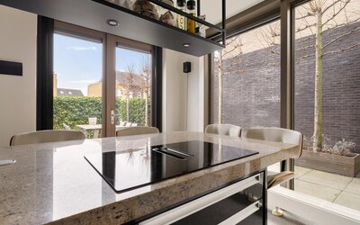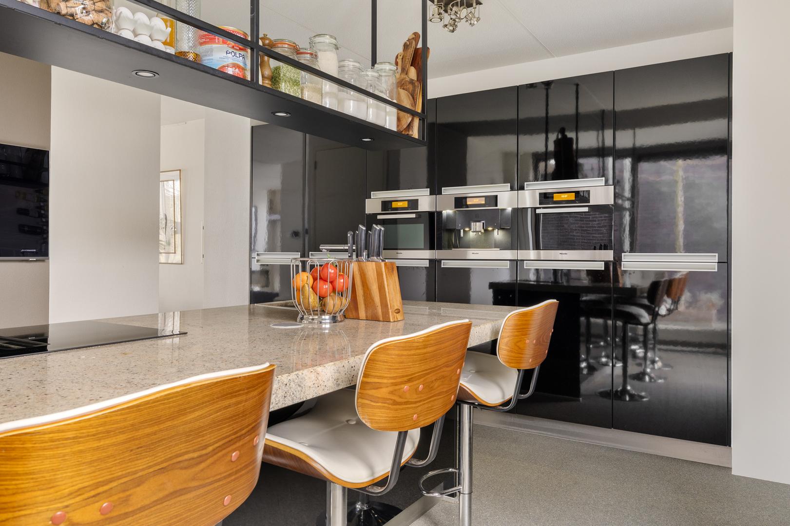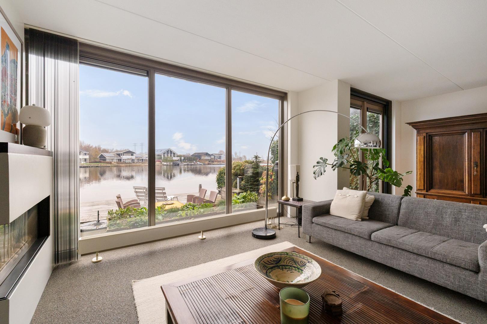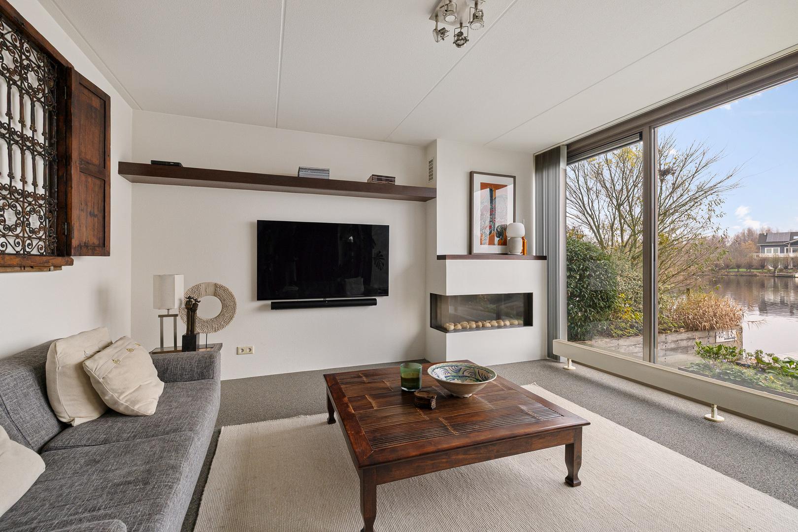 Via de overkapping bereik je de voordeur en stap je binnen in een lichte hal. Vanuit deze entree bereik je de trap naar boven en heb je toegang tot het toilet, de meterkast en een vaste kast. De royale woonkamer strekt zich uit over de volledige achterzijde van de woning, met een brede glazen pui die het uitzicht naar de tuin en het water prachtig omlijst. De zithoek bij de sfeervolle gashaard voelt warm en ruim aan, terwijl een elektrisch zonnescherm zorgt voor comfort op zonnige dagen. Aan de voorzijde vind je de indrukwekkende leefkeuken, uitgevoerd met een luxe kookeiland en een kastenwand die is voorzien van hoogwaardige inbouwapparatuur, waaronder een stoomoven, combioven, hoge koelkast, hoge vriezer, Quooker en diverse apparatuur van Miele. De inductieplaat werd vernieuwd in 2023 en de grindvloer in de keuken is geseald. Dankzij deze moderniseringen voelt de keuken als nieuw. Vanuit de keuken heb je directe toegang naar buiten en naar de garage. De garage is uitgevoerd met een geïsoleerde muur, wat deze ruimte extra bruikbaar maakt.