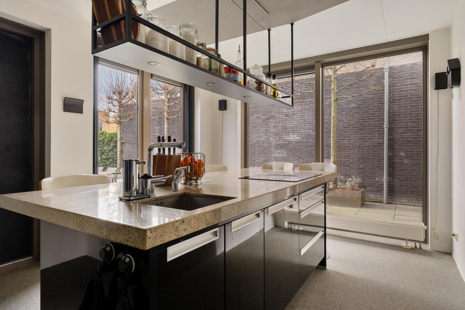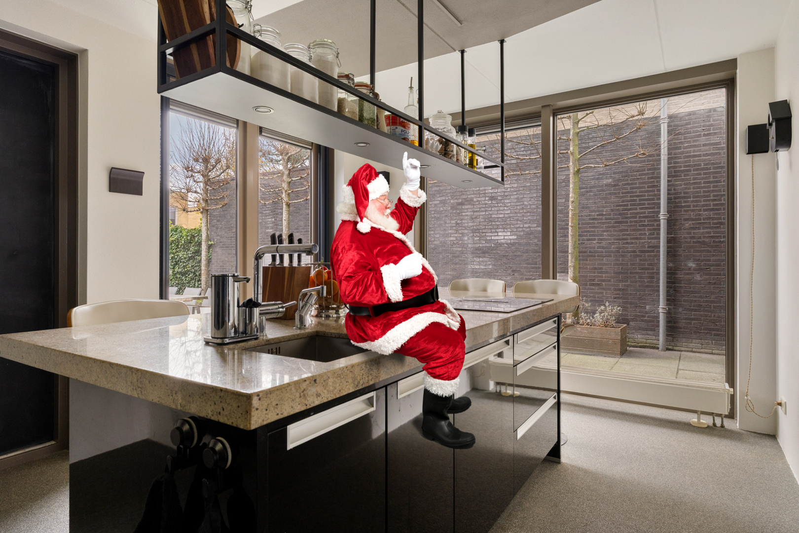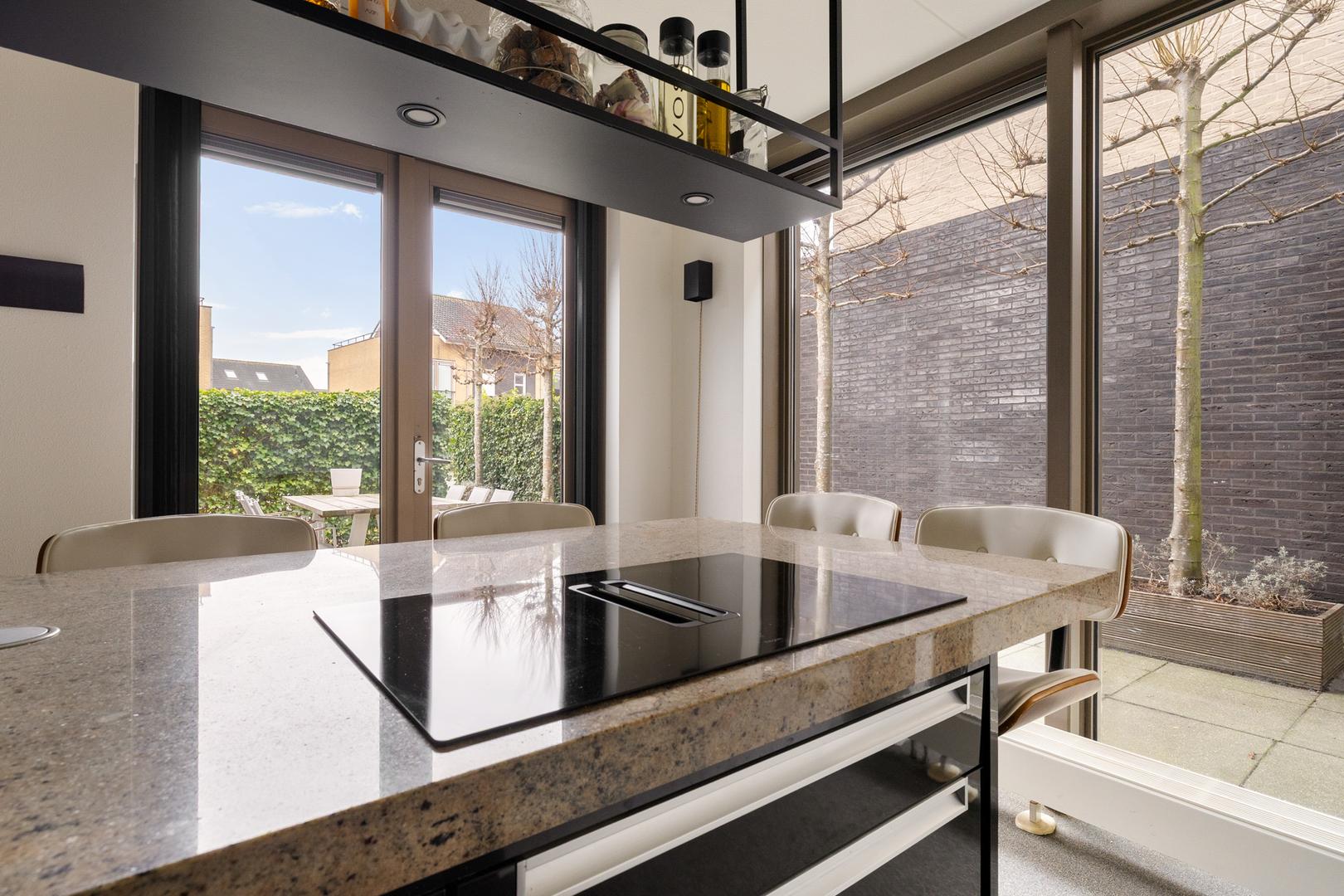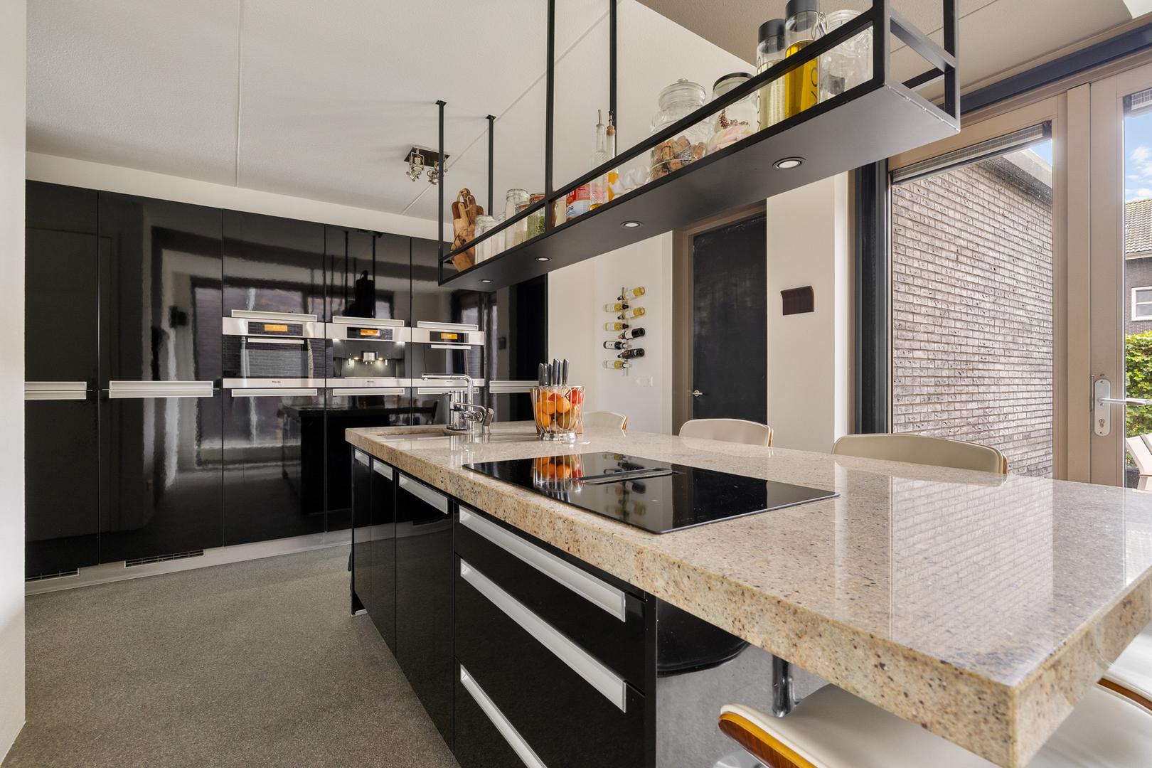 Via de overkapping bereik je de voordeur en stap je binnen in een lichte hal. Vanuit deze entree bereik je de trap naar boven en heb je toegang tot het toilet, de meterkast en een vaste kast. De royale woonkamer strekt zich uit over de volledige achterzijde van de woning, met een brede glazen pui die het uitzicht naar de tuin en het water prachtig omlijst. De zithoek bij de sfeervolle gashaard voelt warm en ruim aan, terwijl een elektrisch zonnescherm zorgt voor comfort op zonnige dagen. Aan de voorzijde vind je de indrukwekkende leefkeuken, uitgevoerd met een luxe kookeiland en een kastenwand die is voorzien van hoogwaardige inbouwapparatuur, waaronder een stoomoven, combioven, hoge koelkast, hoge vriezer, Quooker en diverse apparatuur van Miele. De inductieplaat werd vernieuwd in 2023 en de grindvloer in de keuken is geseald. Dankzij deze moderniseringen voelt de keuken als nieuw. Vanuit de keuken heb je directe toegang naar buiten en naar de garage. De garage is uitgevoerd met een geïsoleerde muur, wat deze ruimte extra bruikbaar maakt.