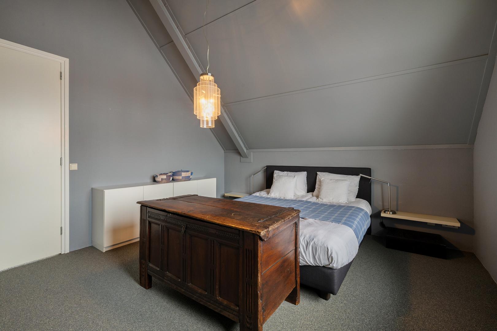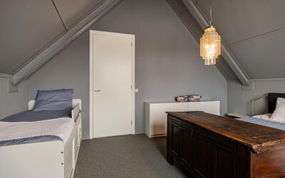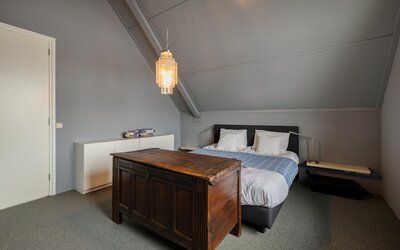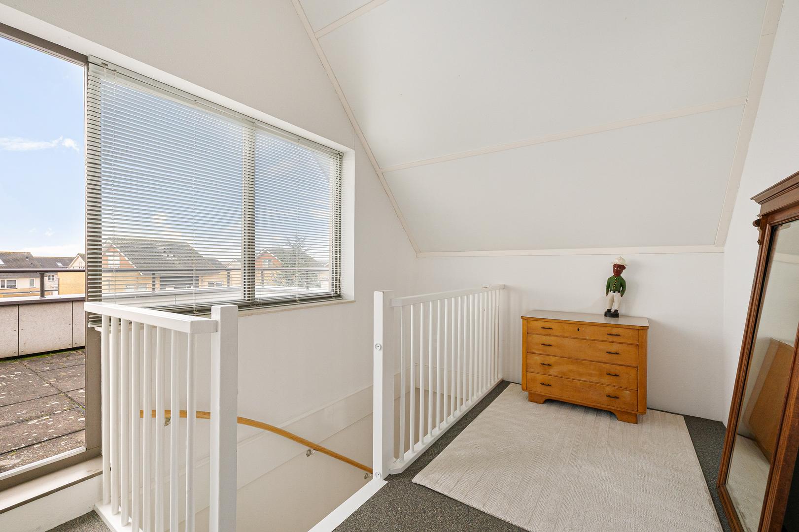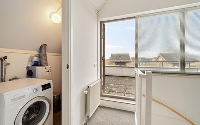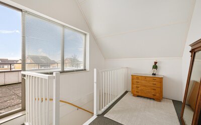 De tweede verdieping biedt een bijzonder ruime vierde slaapkamer met hoge nok en een fijne lichtinval. Daarnaast is er een aparte berging met wasruimte. Vanaf de overloop stap je het royale dakterras op, een heerlijke plek om in alle rust van de zon te genieten.