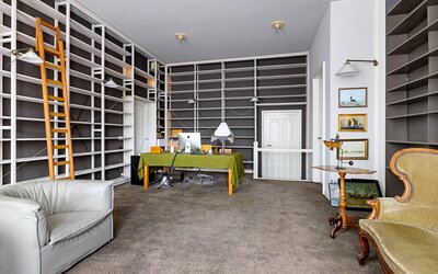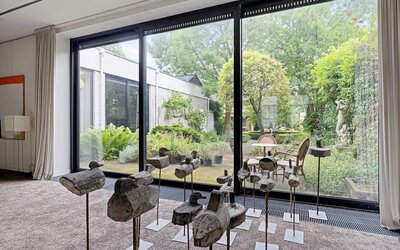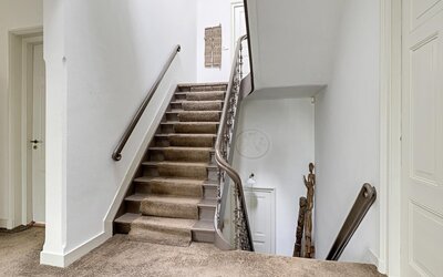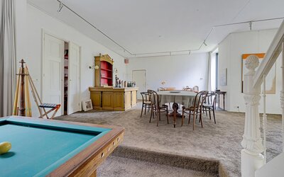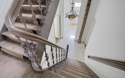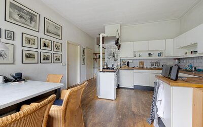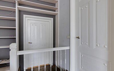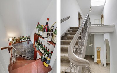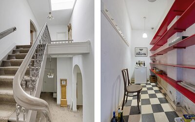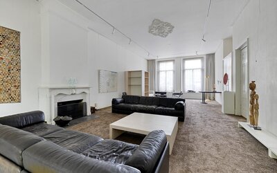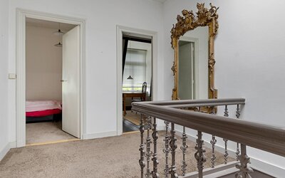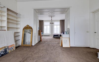 De begane grond biedt maar liefst drie grote woonvertrekken: een woonkamer van ruim 98 m², een salon van ca. 55 m² en een kamer van ca. 39 m². De sfeervolle eetkamer (17 m²) sluit aan op de keuken en geeft via openslaande deuren toegang tot de tuin. Authentieke details, marmeren vloeren en hoge plafonds geven elke ruimte karakter.