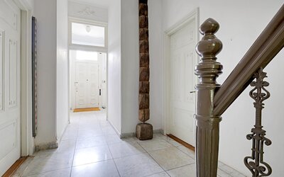 Authentieke details zoals marmer, natuursteen en hoge plafonds met ornamenten.