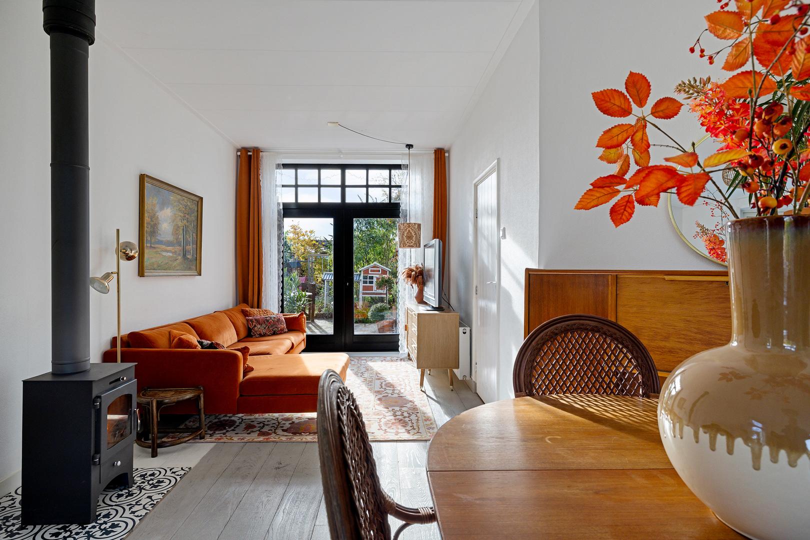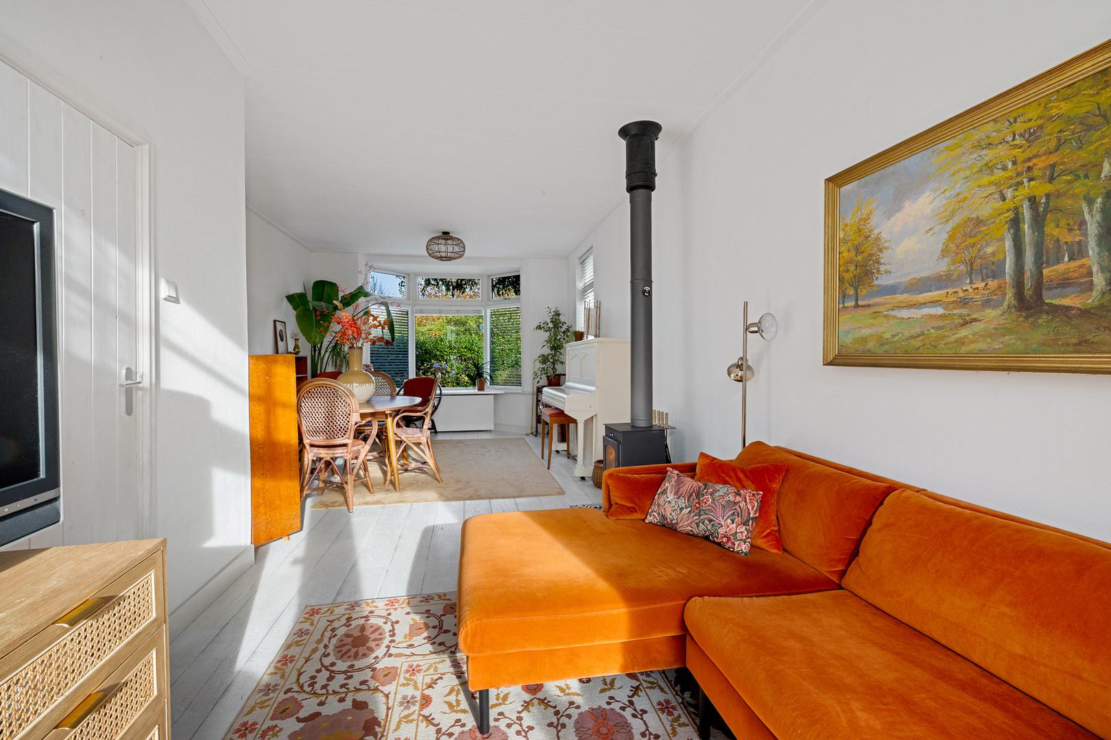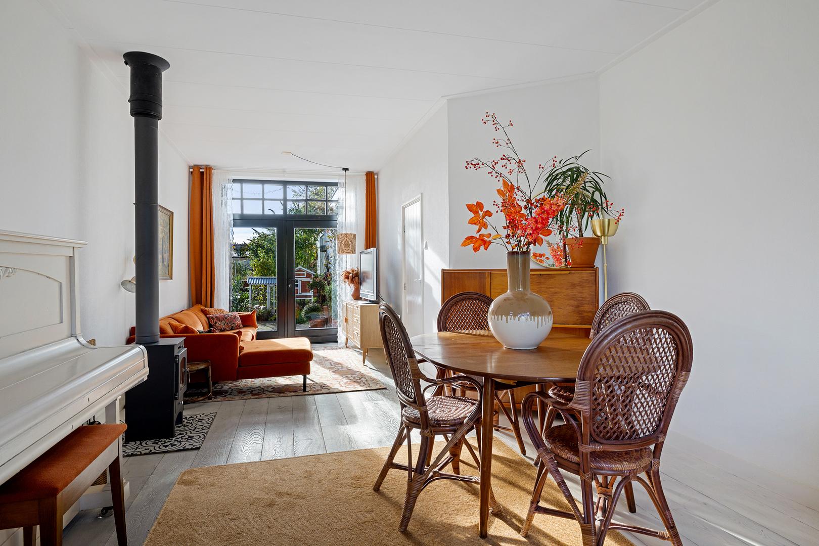 De lichte woonkamer met erker aan de voorzijde ademt karakter: hoge plafonds, grote ramen, authentieke details en een prettige indeling. De houtkachel vormt het warme hart van de ruimte, perfect voor gezellige avonden, terwijl het uitzicht op de groene voortuin zorgt voor rust en verbinding met buiten.