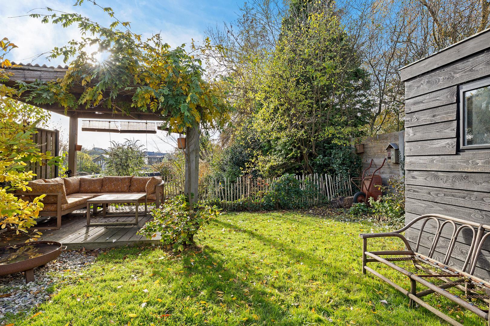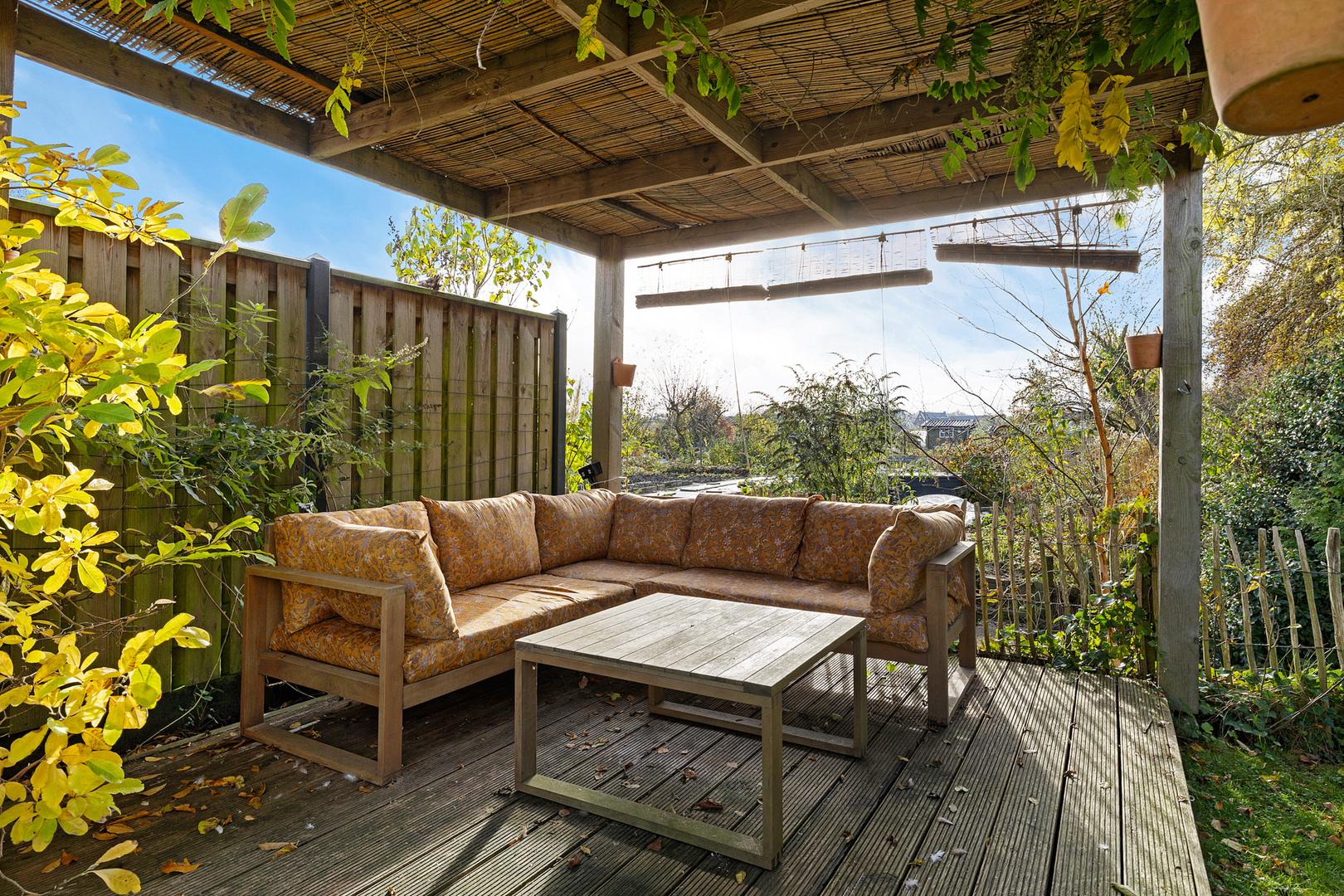 Een gezellige veranda met pergola vormt het hart van de tuin, de ideale plek voor lange zomeravonden, borrels met vrienden of een rustige ochtend met koffie en uitzicht over het water en het groen.