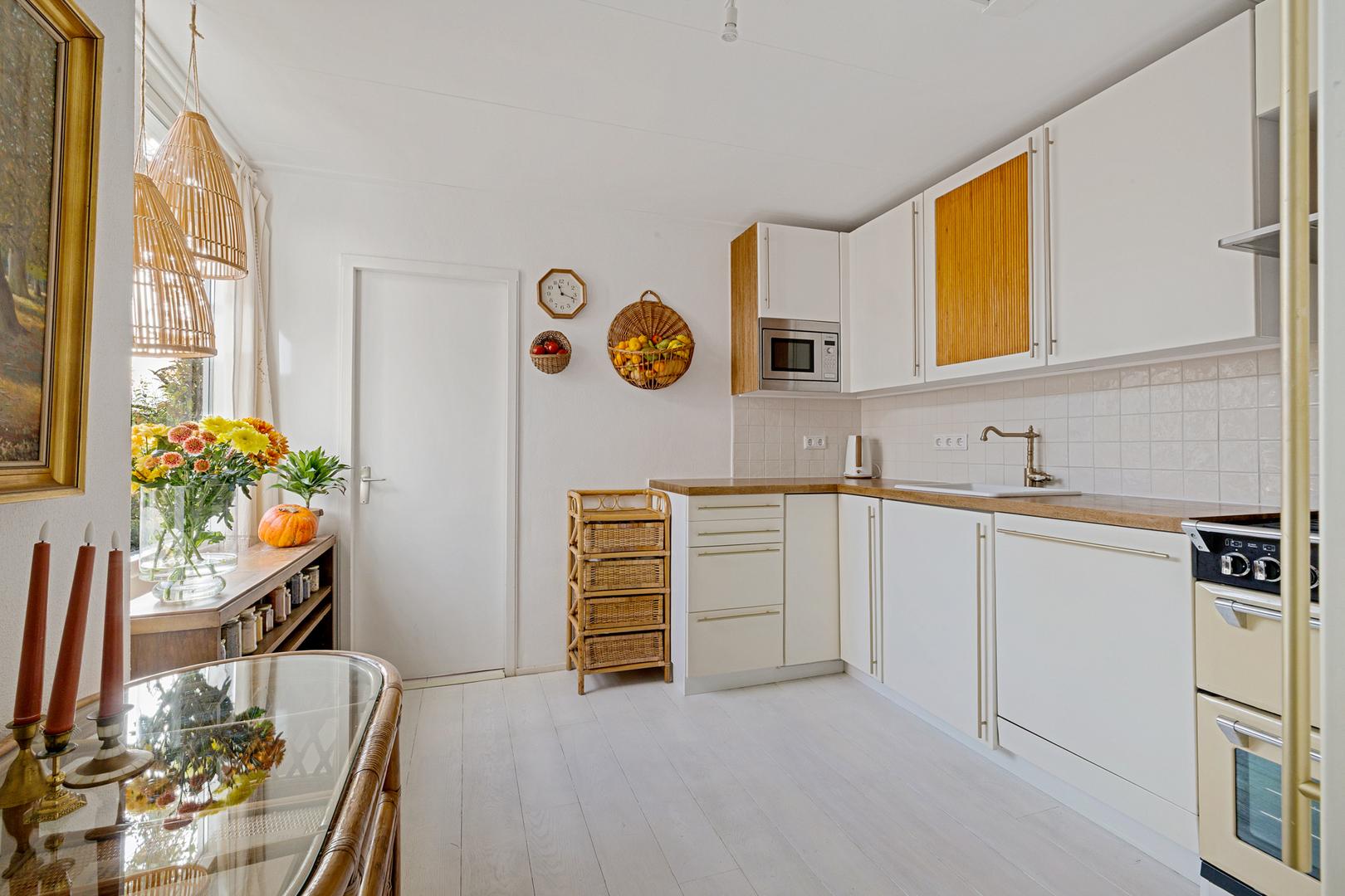 De keuken ligt centraal in het huis en is fijn uitgevoerd, met lichte fronten, een houten werkblad en een stijlvol fornuis. Het geheel vormt een rustige en sfeervolle ruimte die uitstekend past bij het karakter van de woning. De keuken sluit bovendien aan op het buitenterras, waardoor koken en buitenleven naadloos in elkaar overlopen.