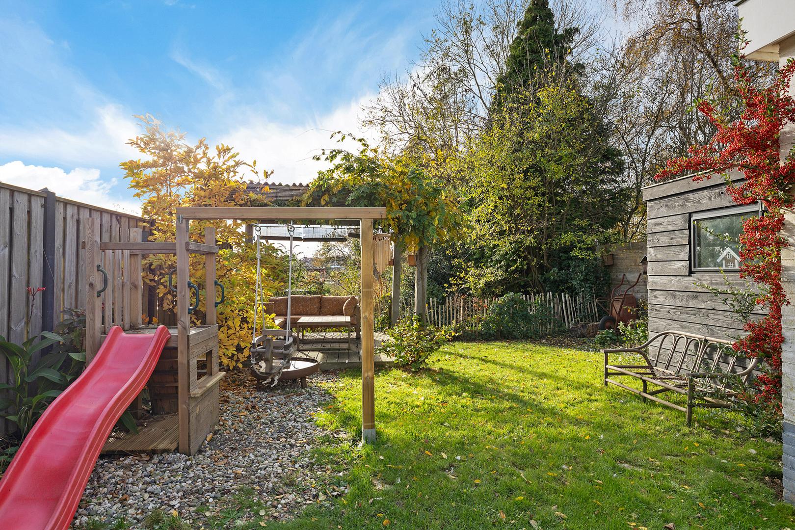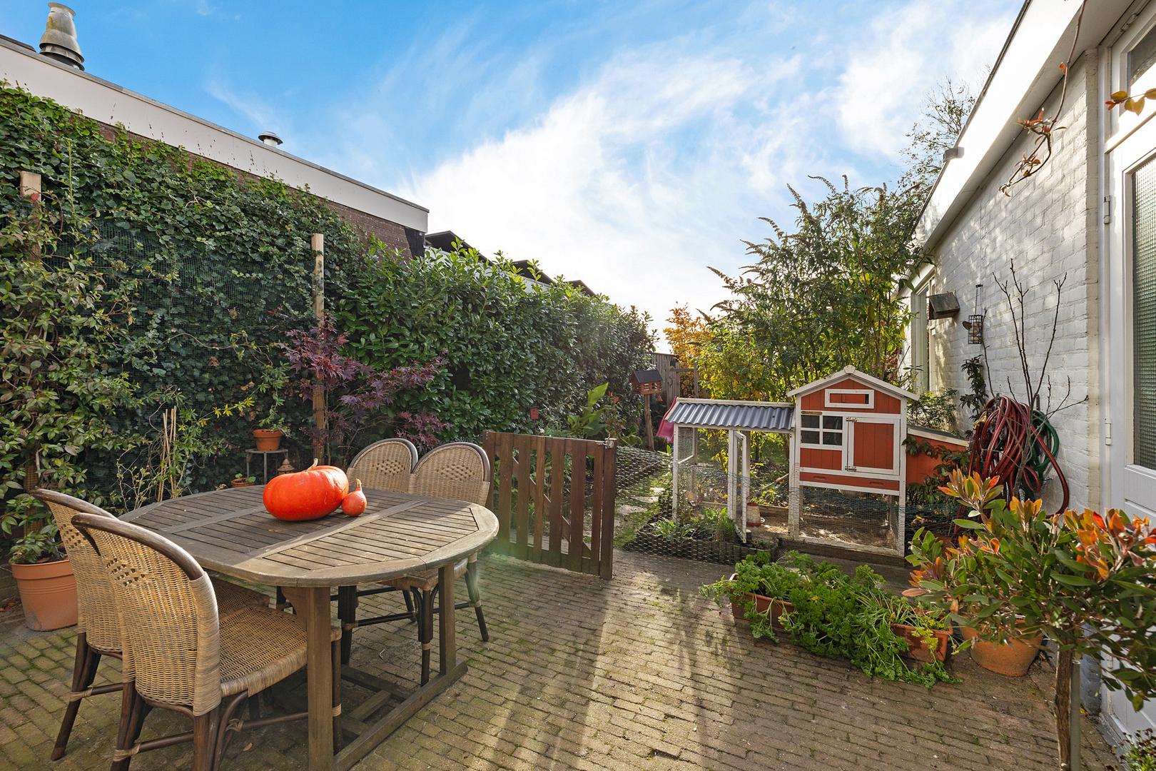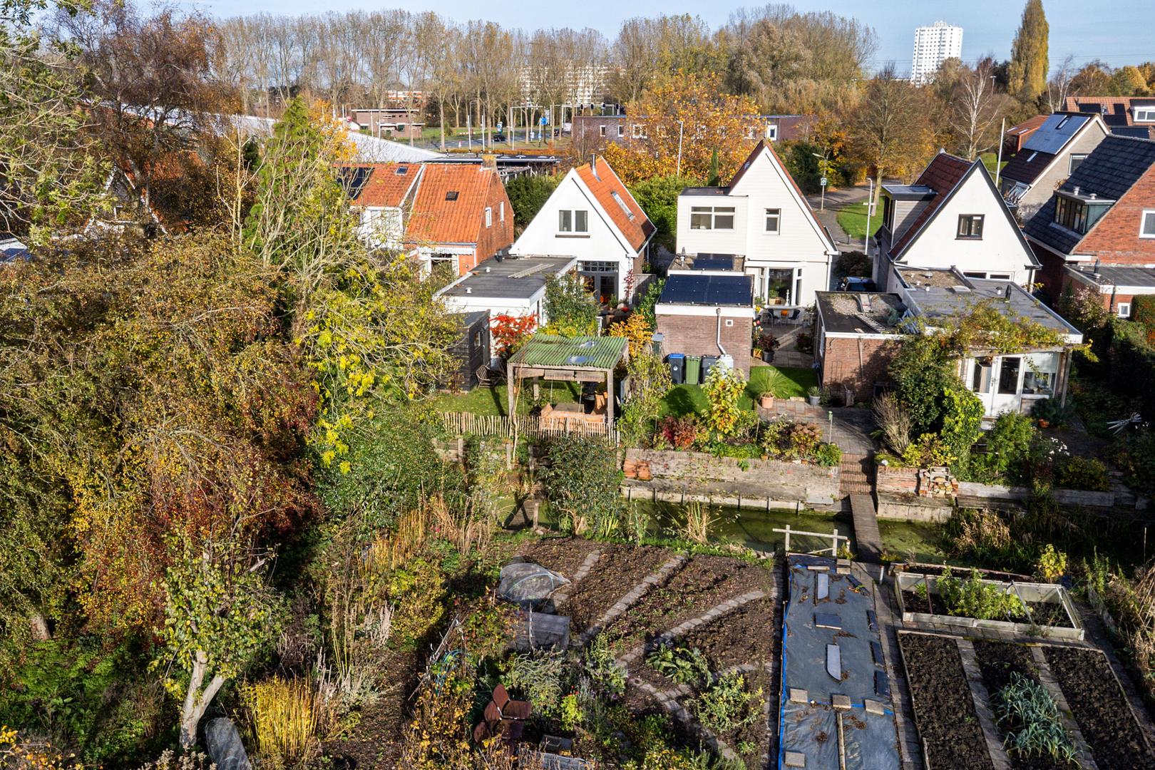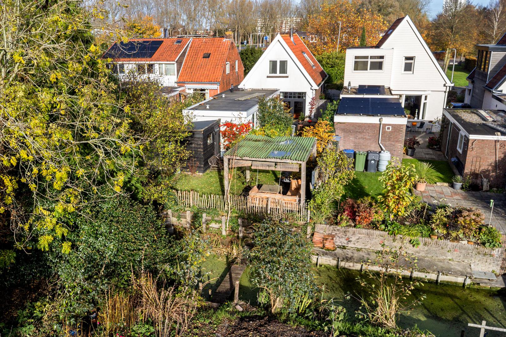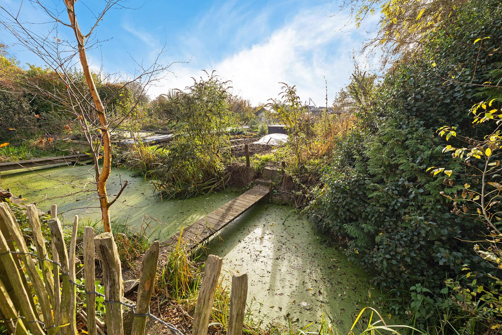 De achtertuin op het zuiden is een heerlijke plek om tot rust te komen. De tuin grenst direct aan het water en heeft een natuurlijke, groene uitstraling met veel privacy.