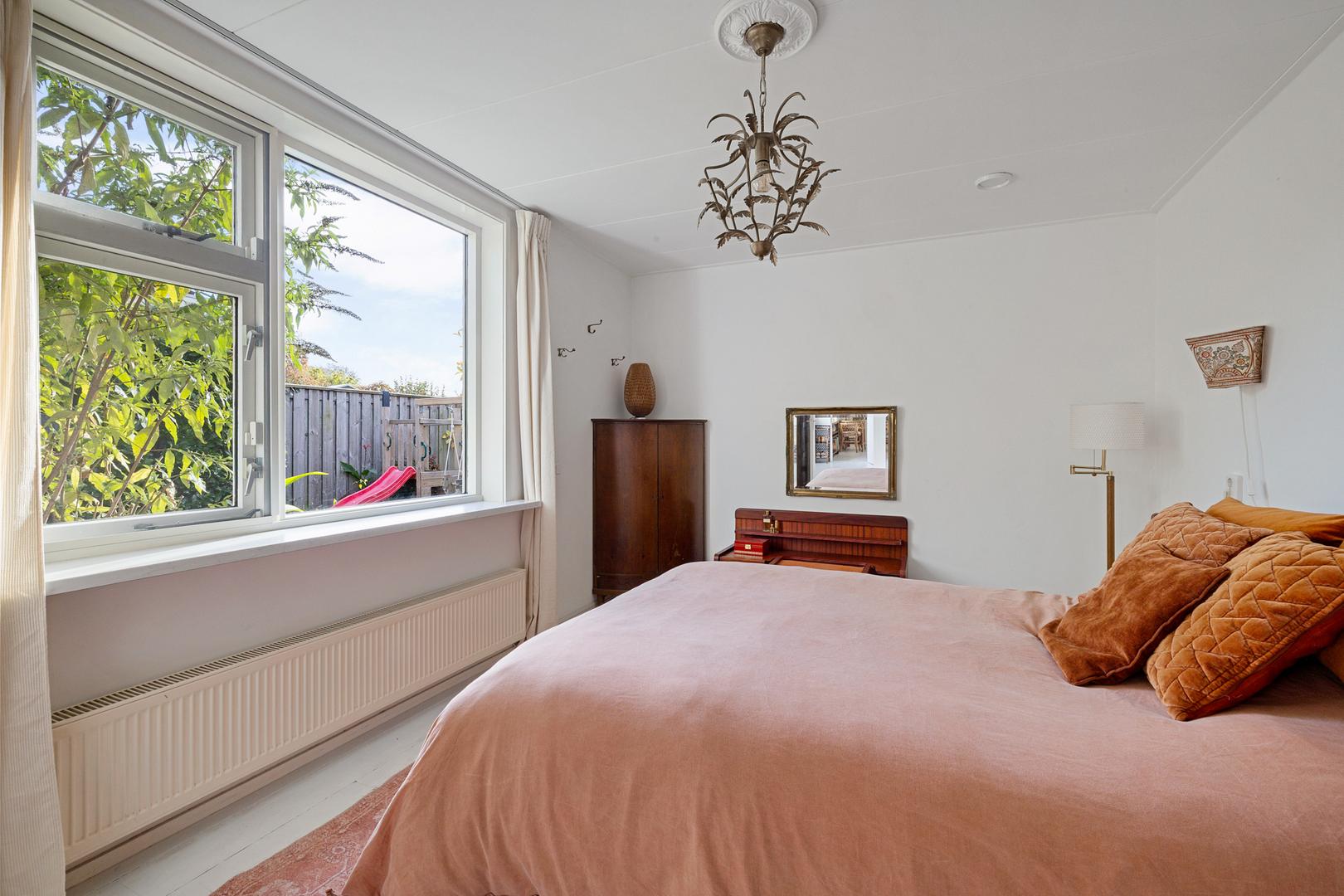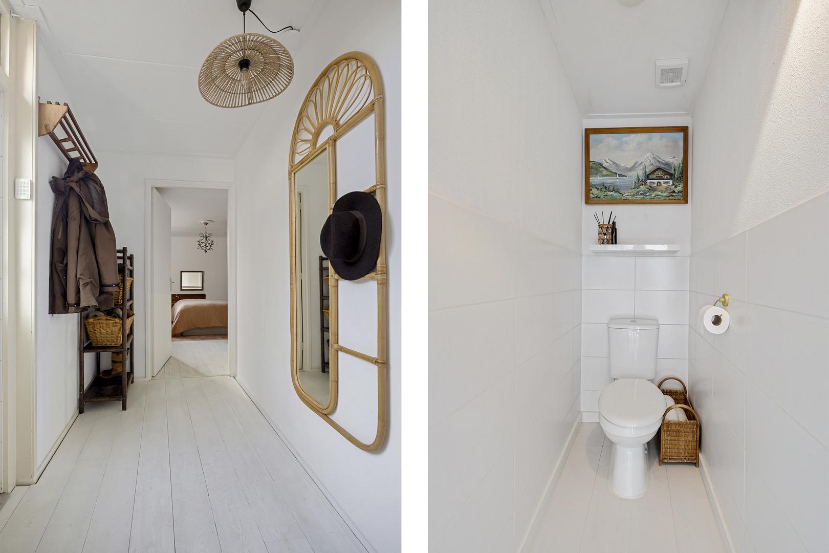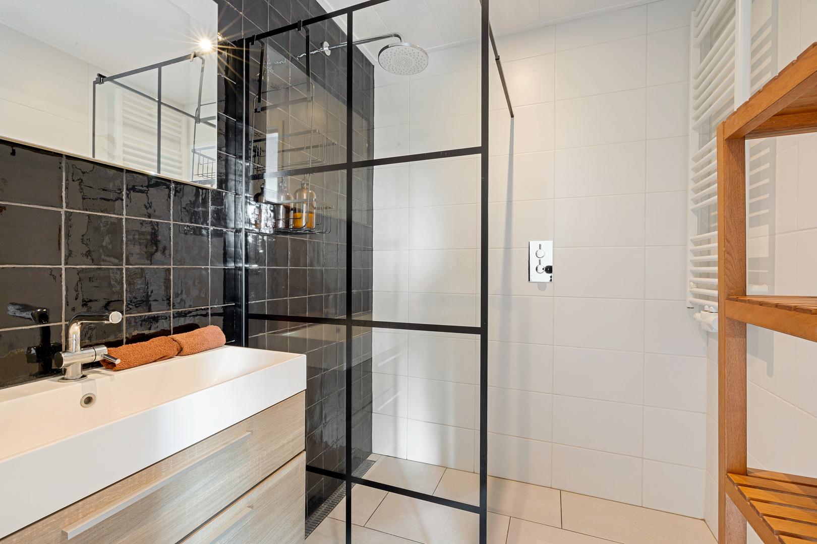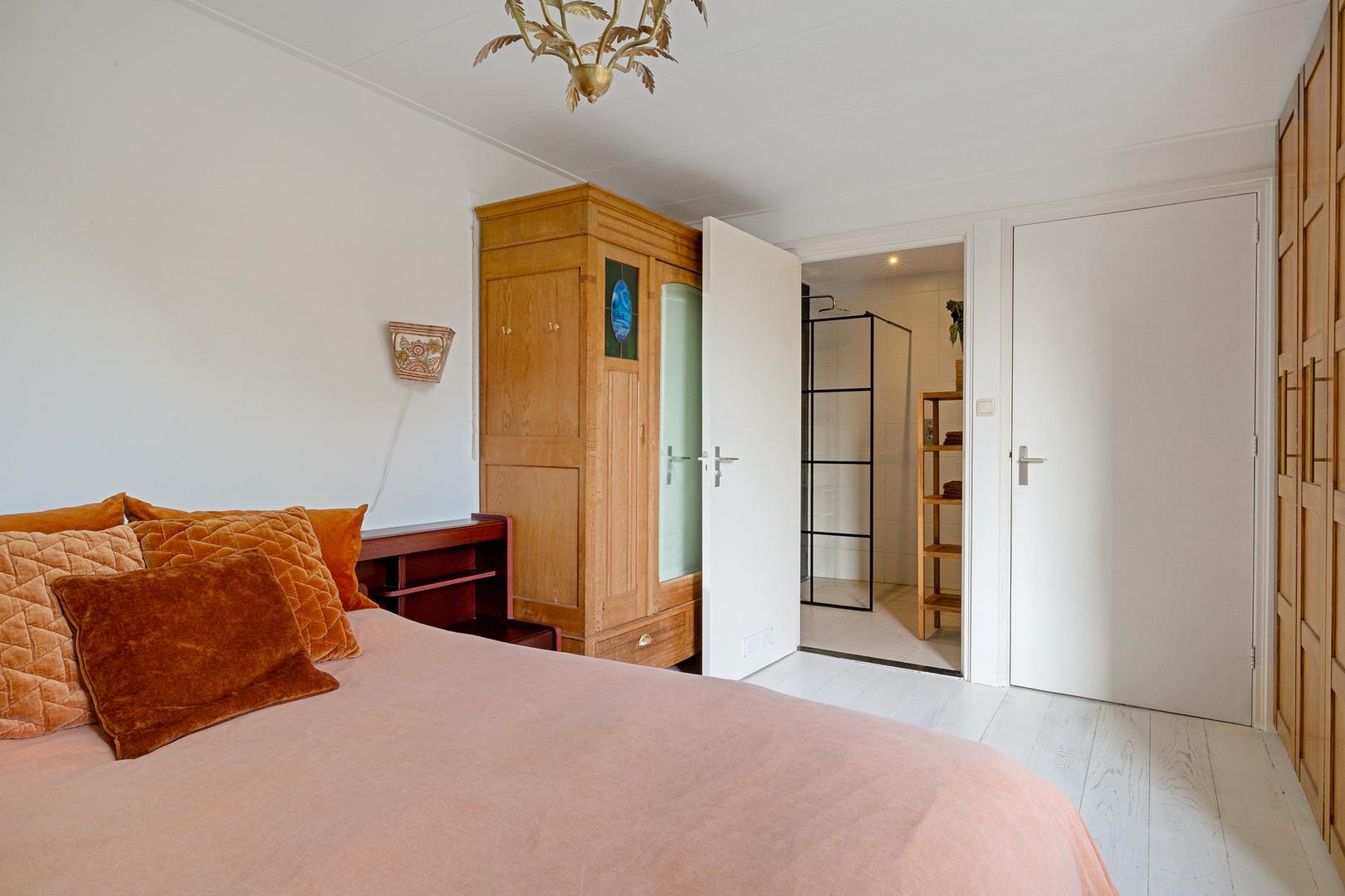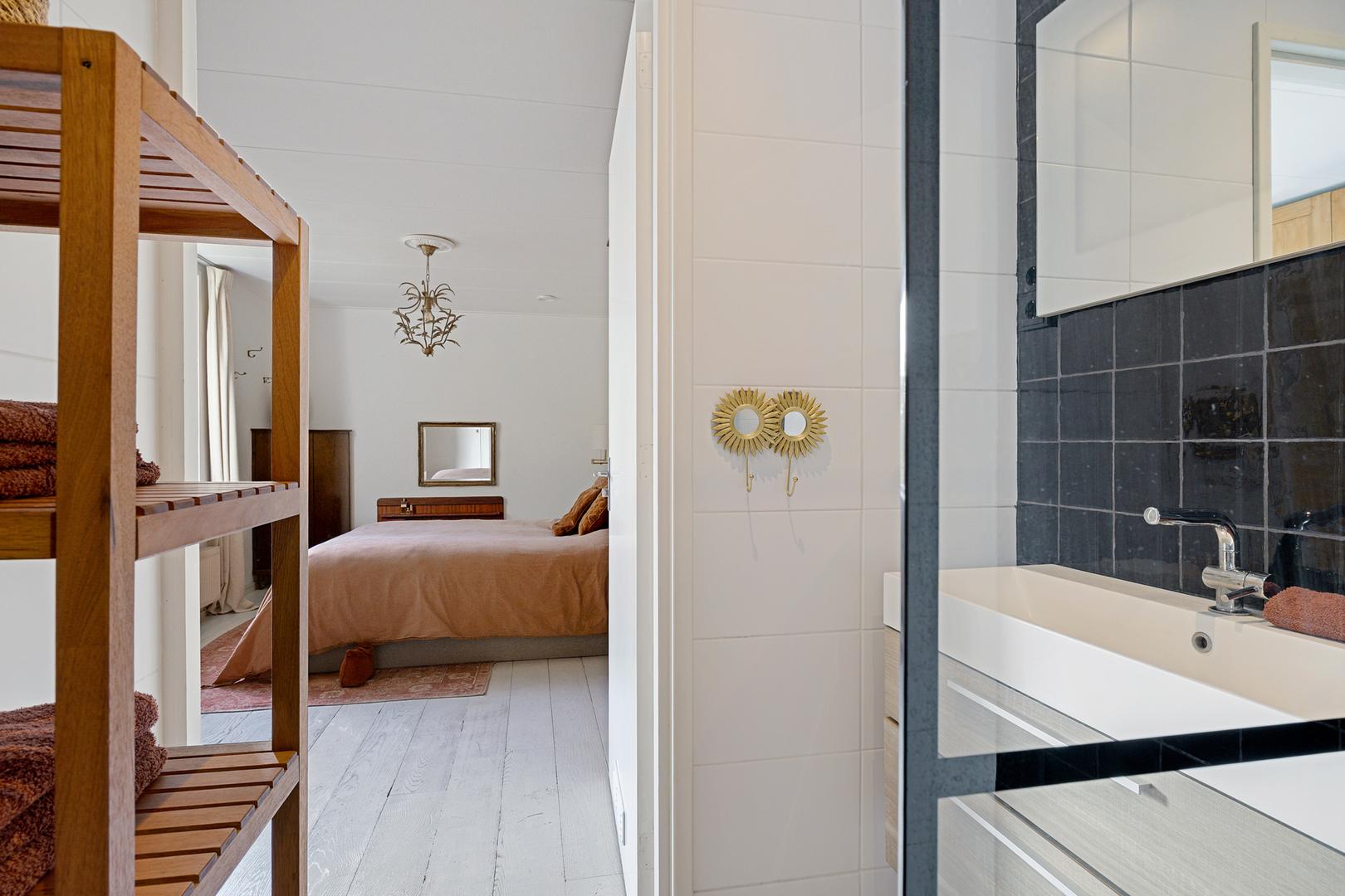 Via de hal bereik je de ruime slaapkamer aan de achterzijde, een fijne, rustige plek met zicht op het groen. De naastgelegen badkamer is modern afgewerkt met een inloopdouche, wastafelmeubel en designradiator. Daarnaast vind je op de begane grond een separaat toilet, een berging en toegang tot een kelderkast.