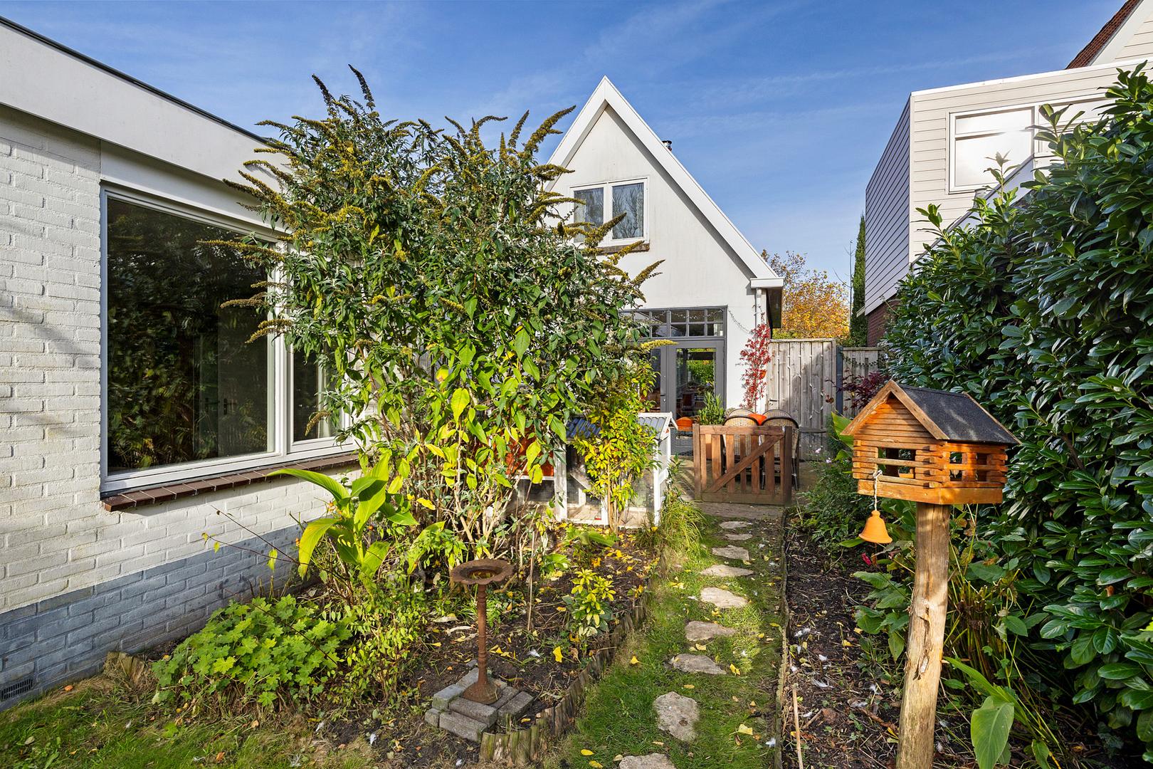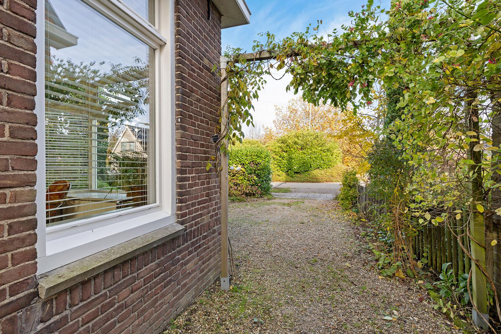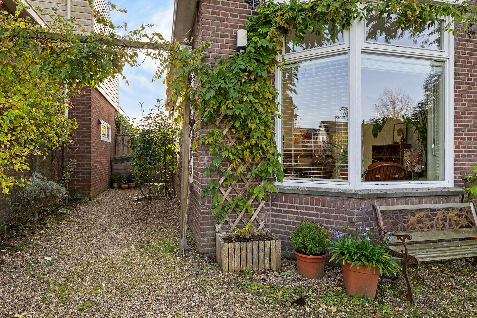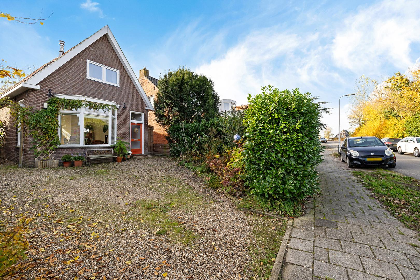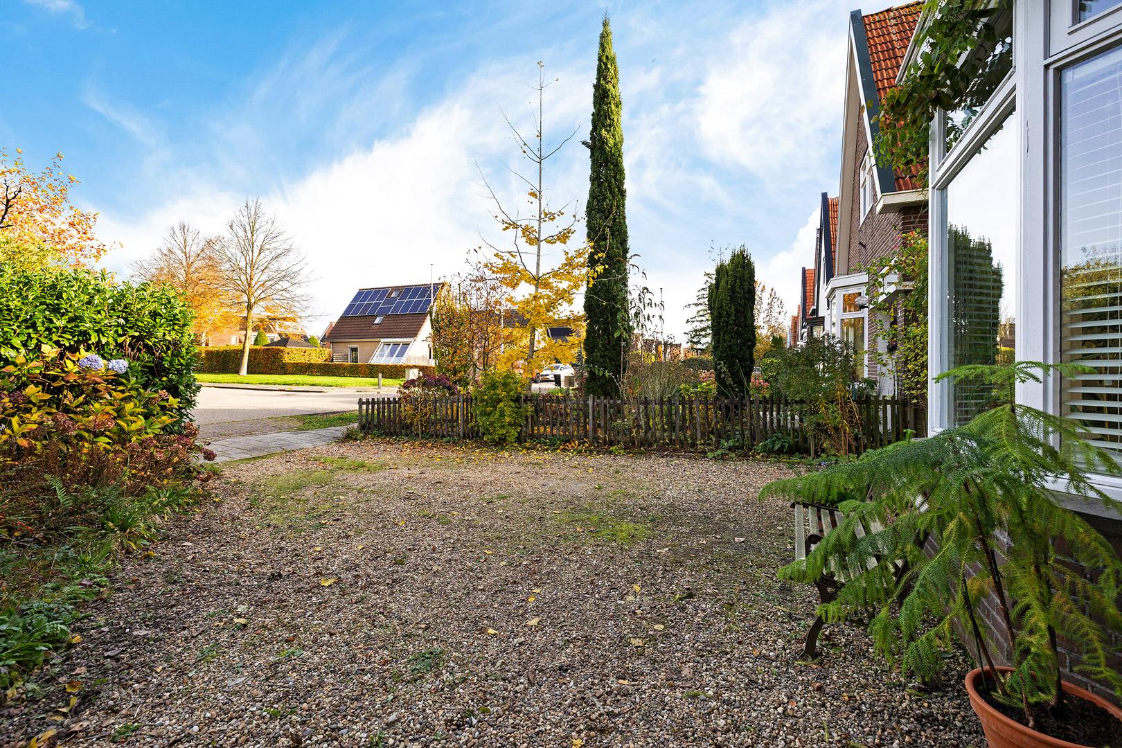 Aan de voorzijde van het huis ligt een royale voortuin met een lange oprit waar gemakkelijk meerdere auto’s kunnen staan. De voortuin is fraai aangelegd met diverse beplanting en biedt een uitnodigende entree richting de woning.
