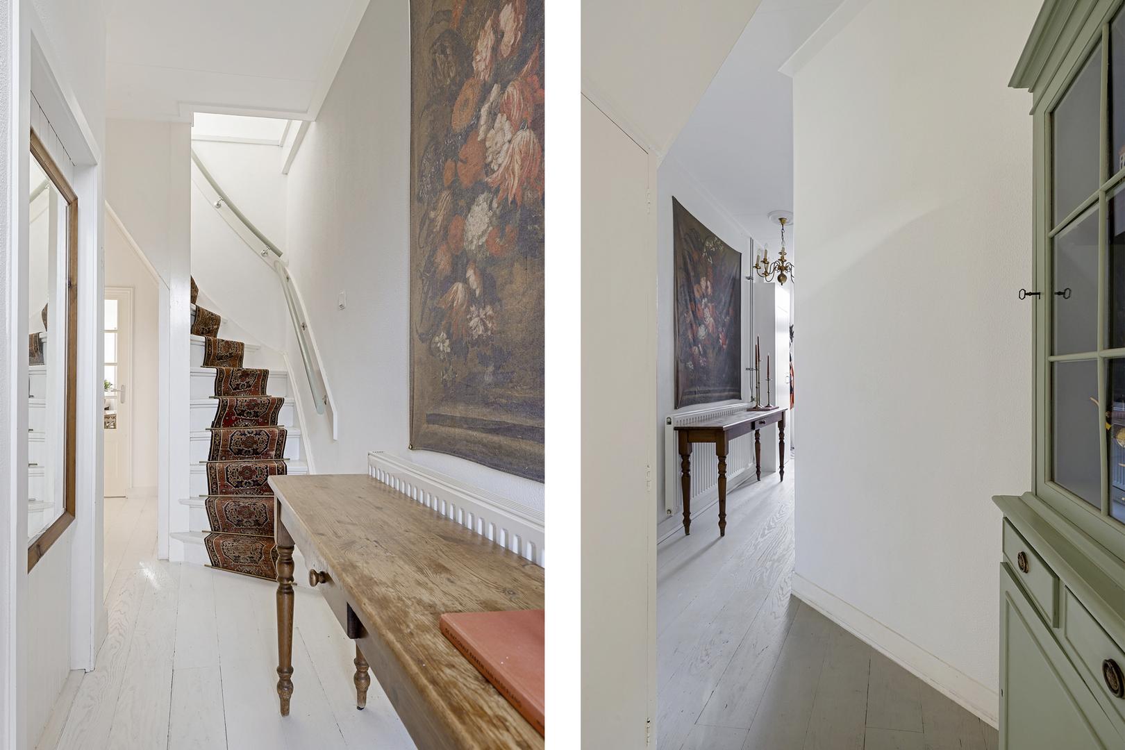 Je betreedt de woning via de ruime hal met trapopgang en doorgang naar de woonkamer.