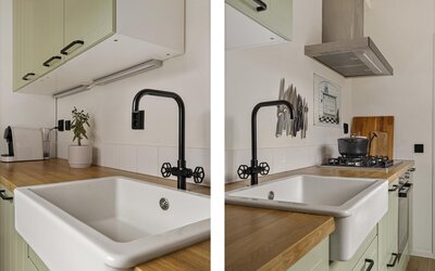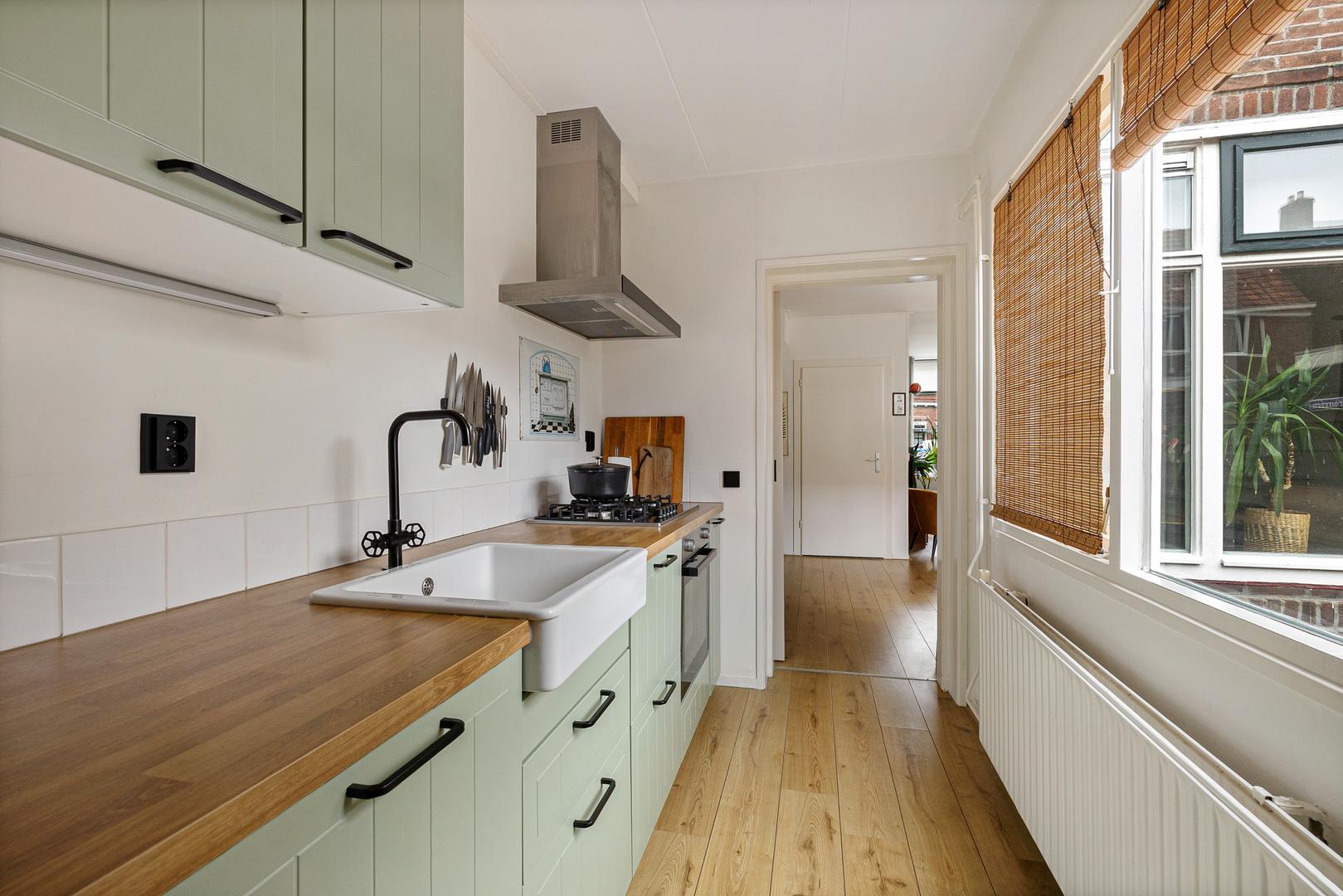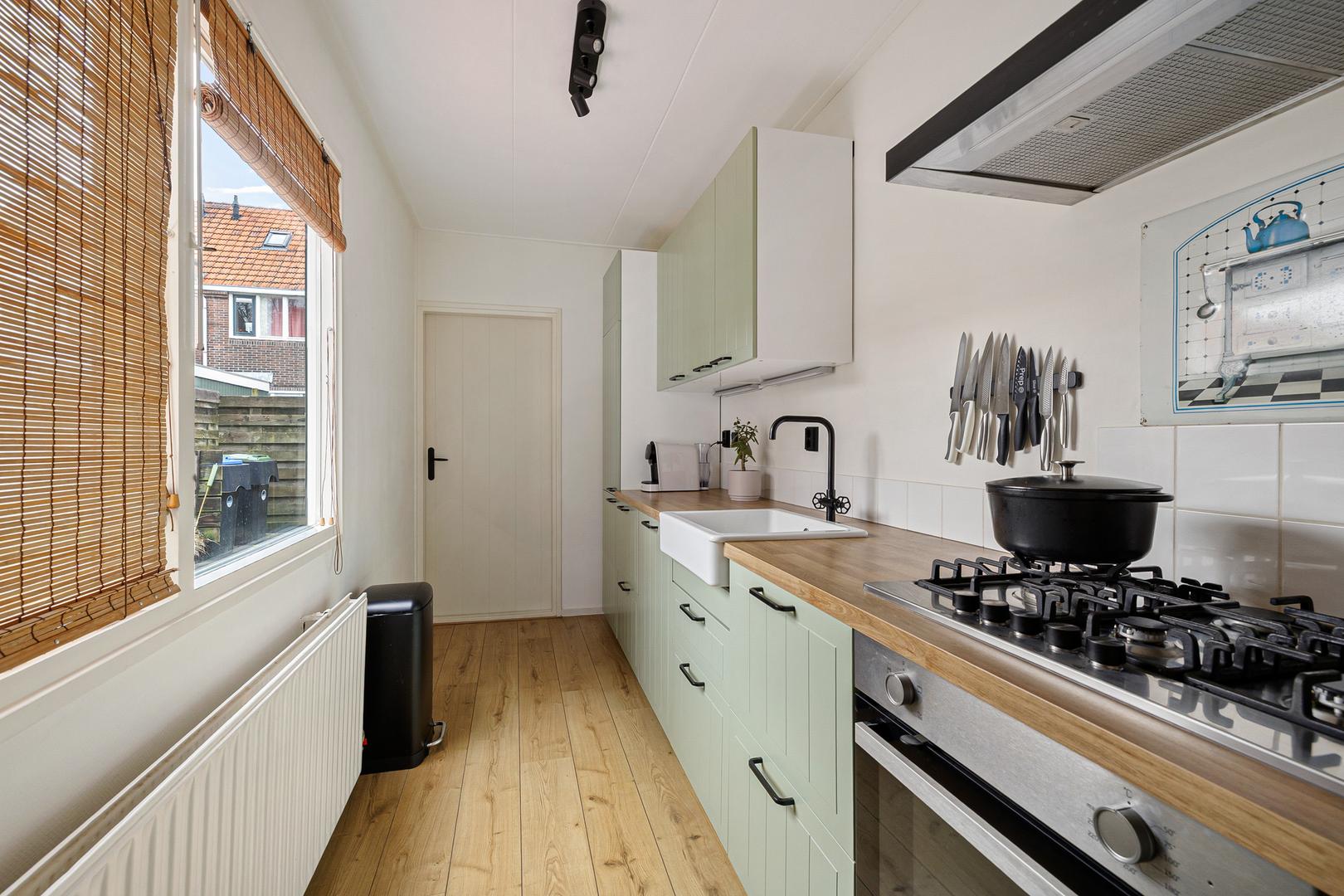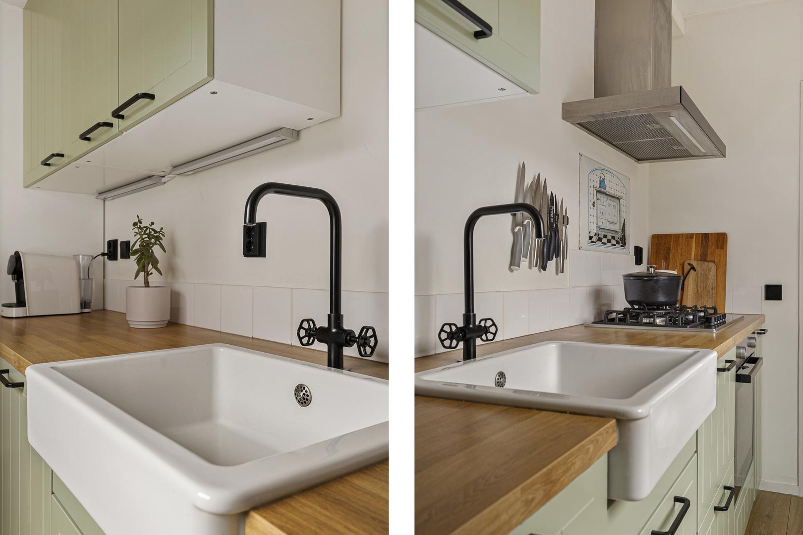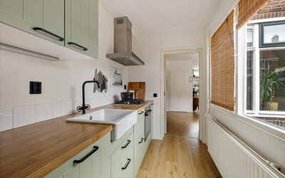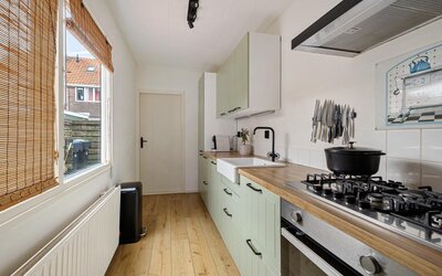 Aan de achterzijde ligt de keuken uit 2024 (ca. 7,3 m²). Deze is praktisch ingericht in een rechte opstelling en heeft een frisse, moderne uitstraling. De groentinten in combinatie met het houten werkblad en de robuuste spoelbak geven de keuken karakter en een warme uitstraling. De keuken is bovendien voorzien van inbouwapparatuur, zoals een vaatwasser, koel-/vriescombinatie en oven. Vanuit de keuken is er toegang tot de berging/bijkeuken (ca. 5,7 m²), ideaal voor voorraad, witgoed en extra opslagruimte.