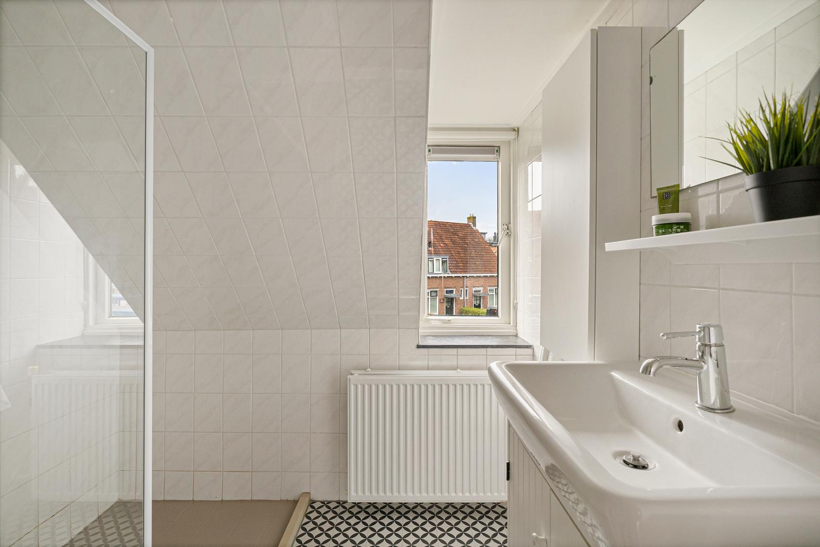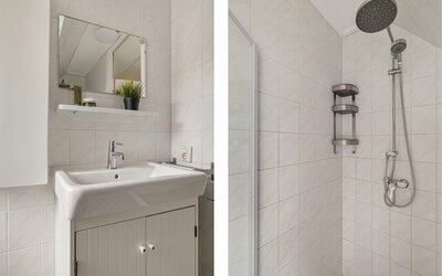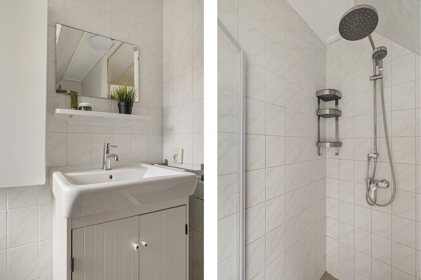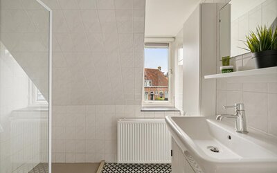De badkamer (ca. 2,9 m²) is compact maar praktisch ingedeeld. Je beschikt over een wastafelmeubel, daglicht via het raam en een prettige douche met moderne (regen)douchekop.