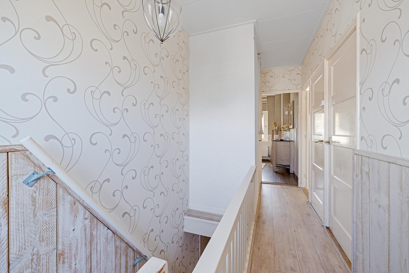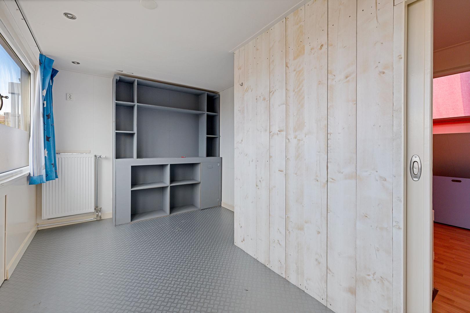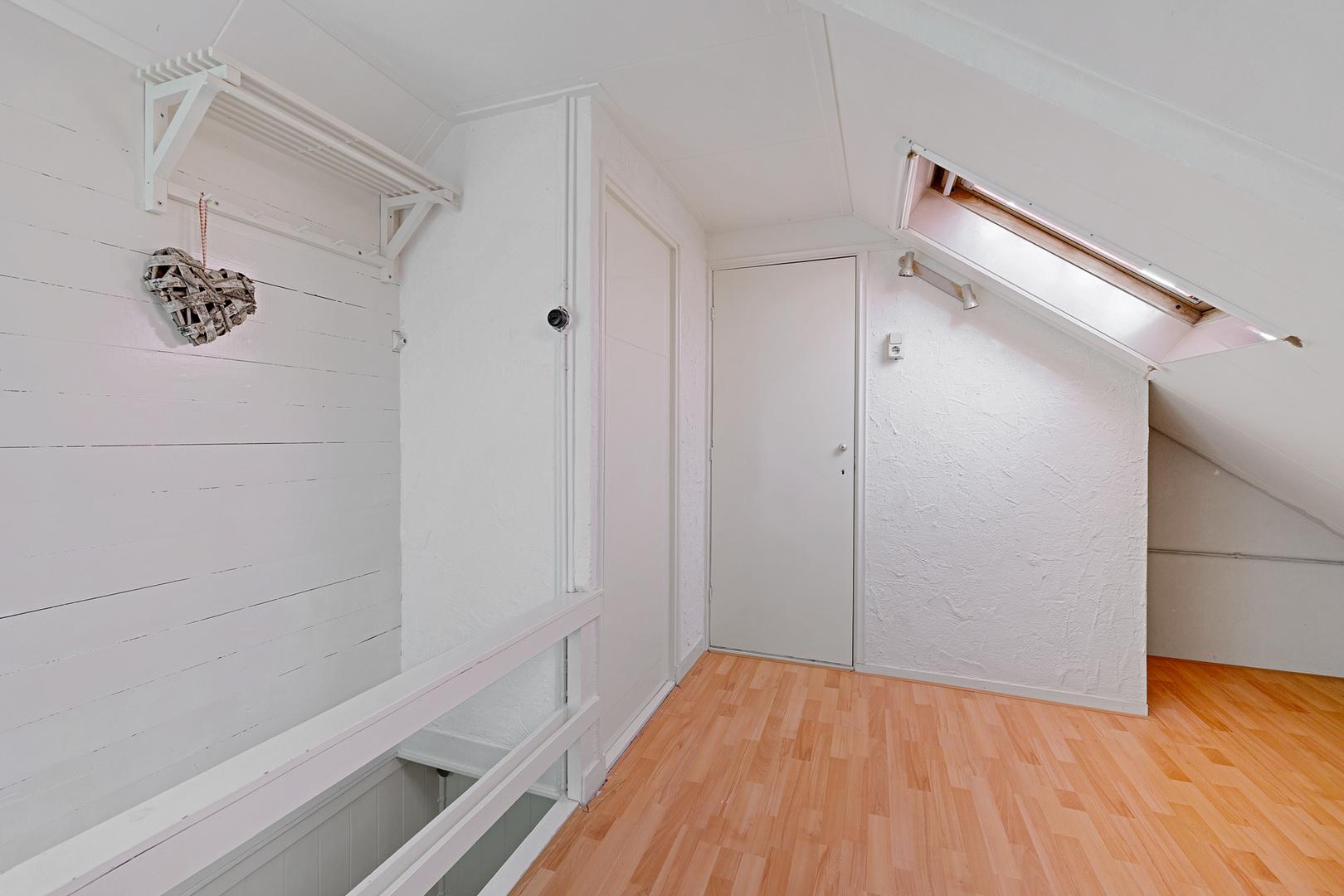 De tweede verdieping biedt een derde slaapkamer (ca. 11,4 m²), sfeervol door de schuine kap en voorzien van extra bergruimte achter de knieschotten. De overloop (ca. 8,8 m²) heeft eveneens bergruimte en is groot genoeg voor bijvoorbeeld een werkhoek of hobbyruimte.