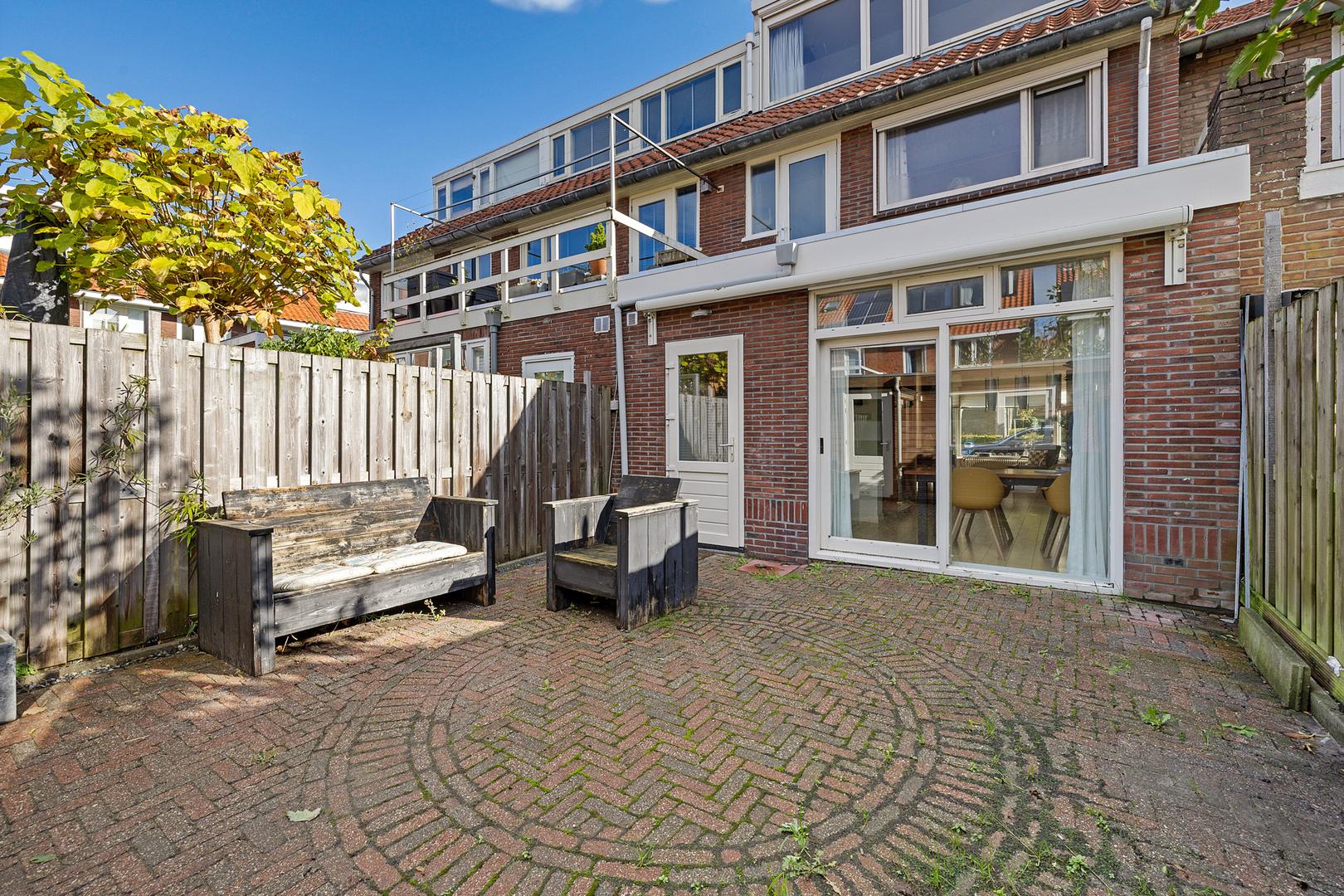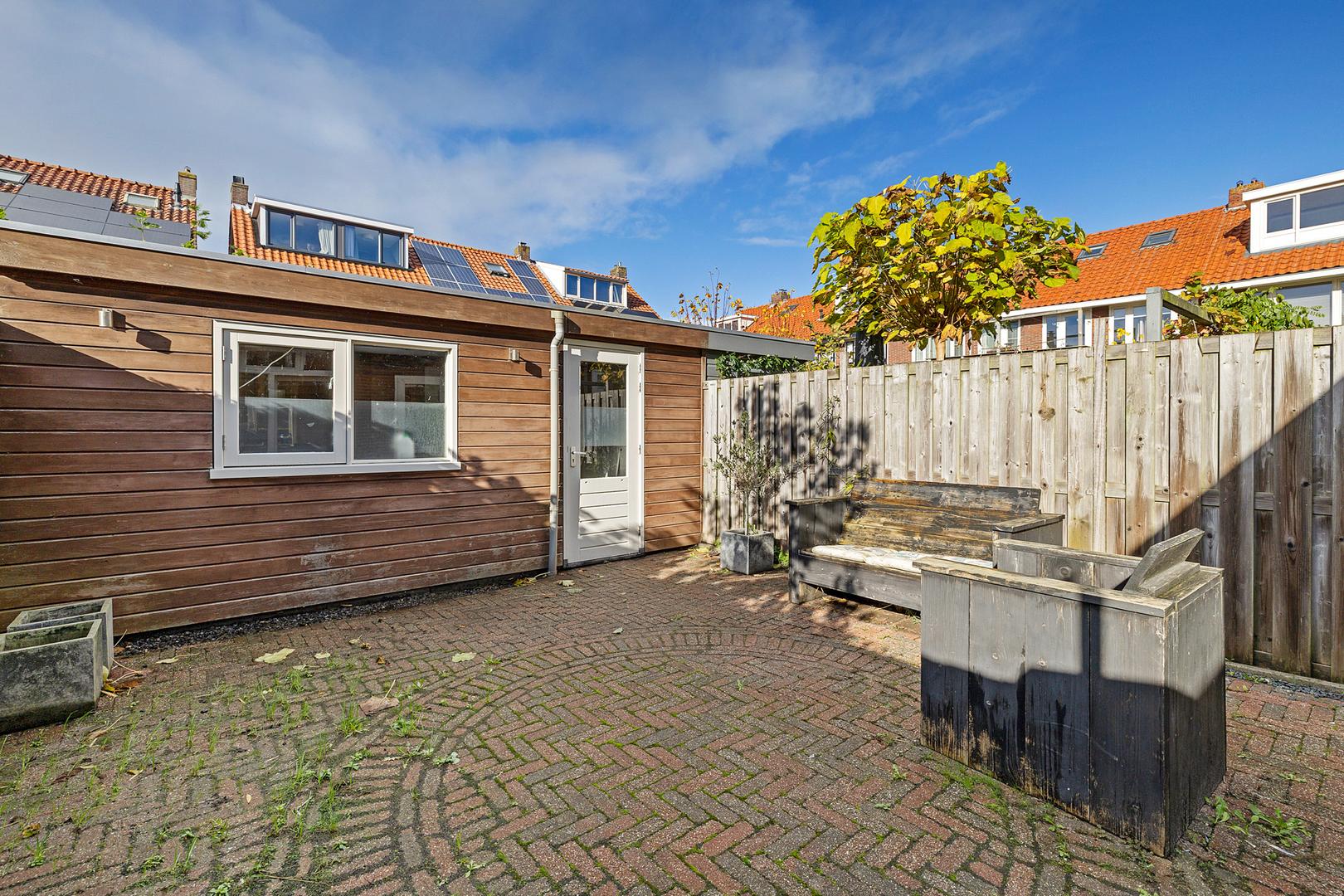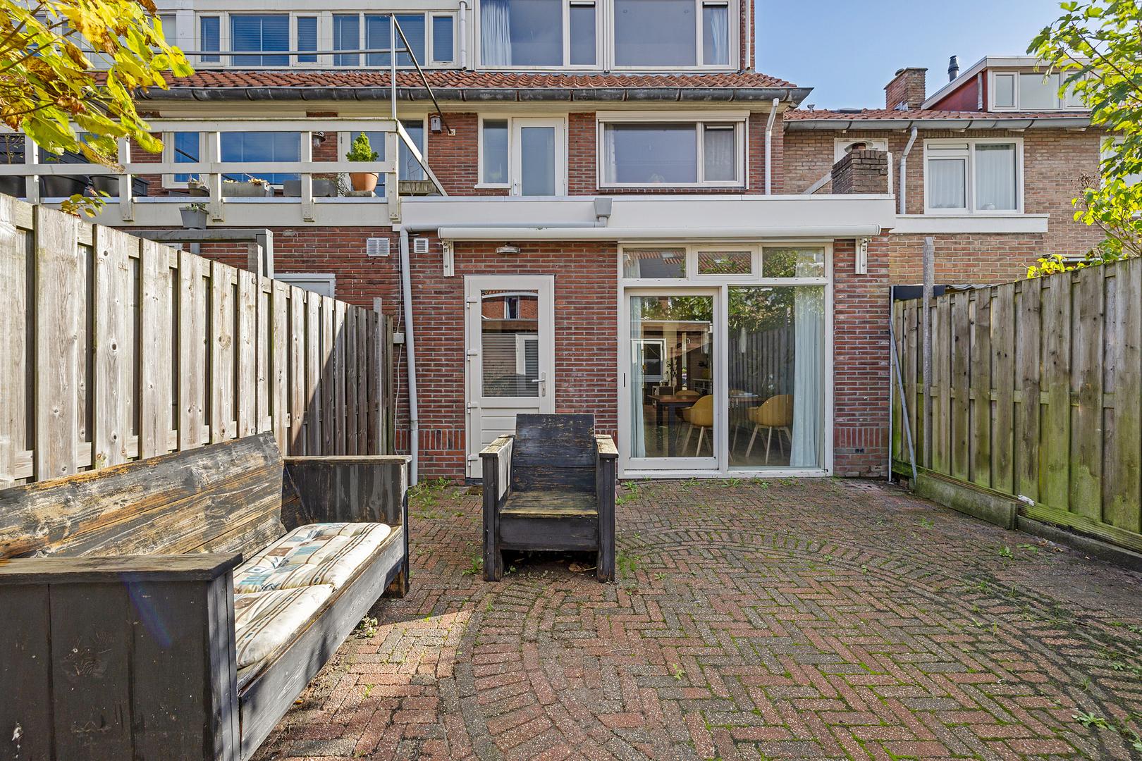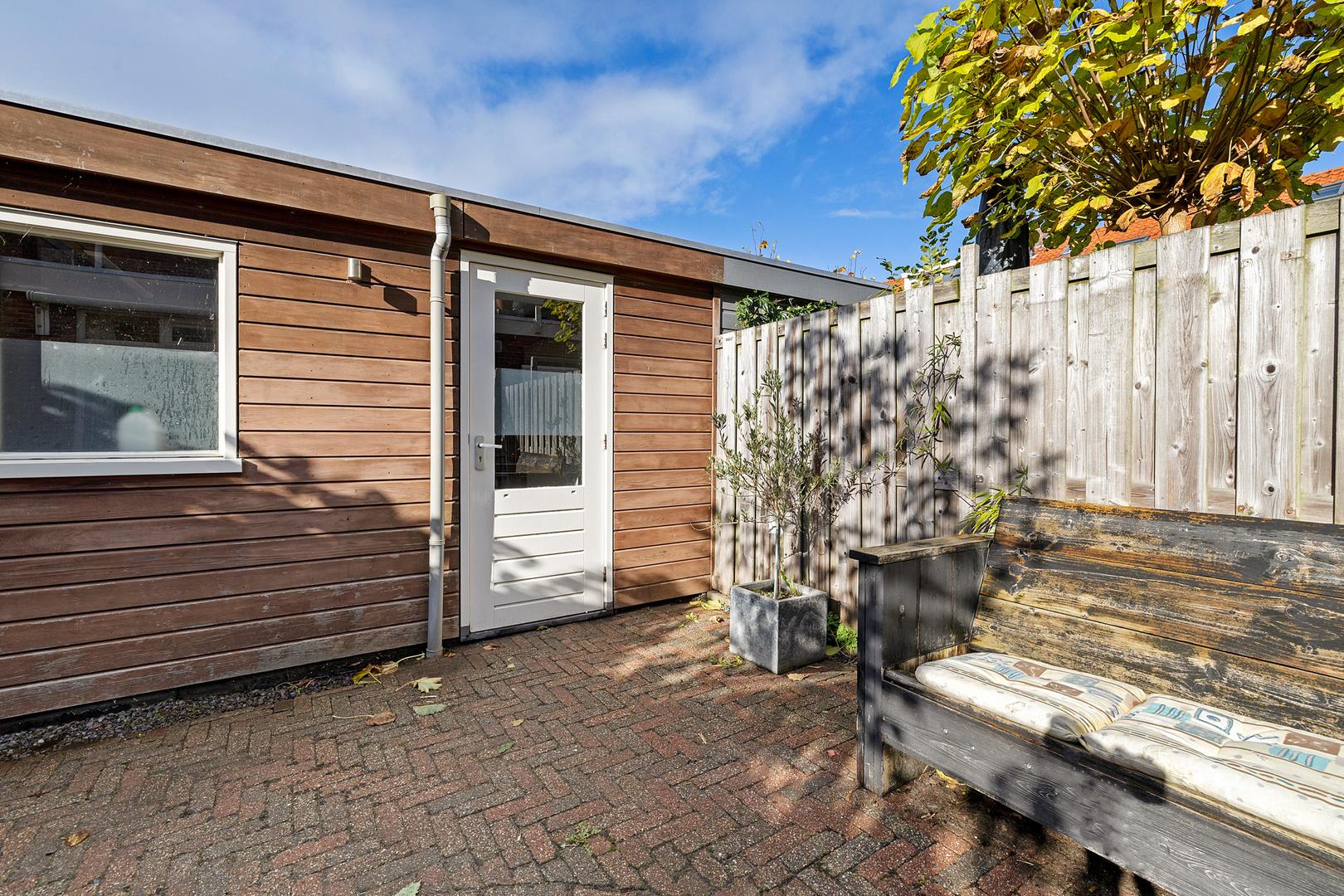 Achter de woning ligt een knusse achtertuin met een grote berging, ideaal voor fietsen, tuinspullen of extra opslag. Op zonnige dagen kun je hier heerlijk buiten zitten; zet er een tafeltje en wat planten neer en je hebt je eigen gezellige plekje midden in de stad.