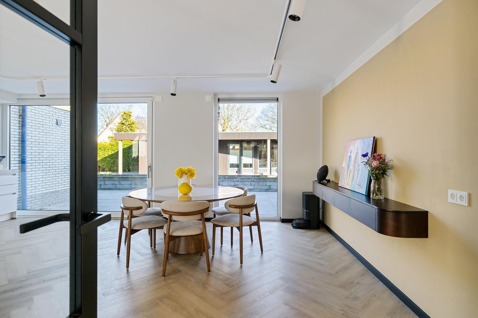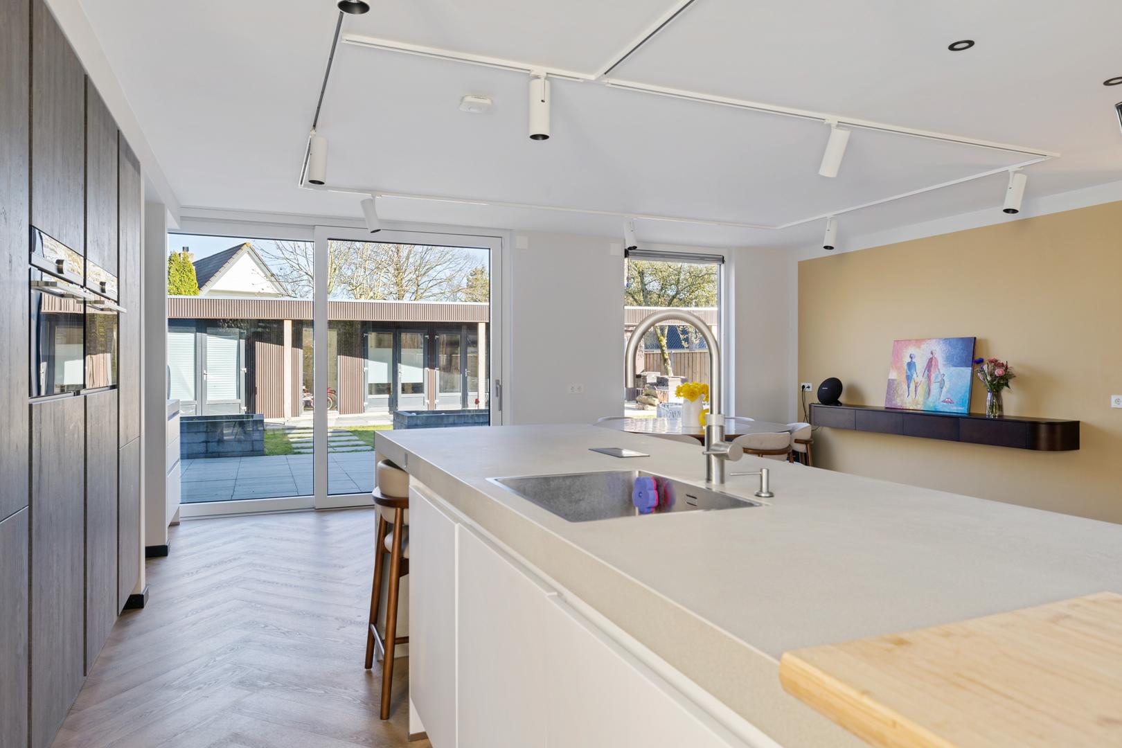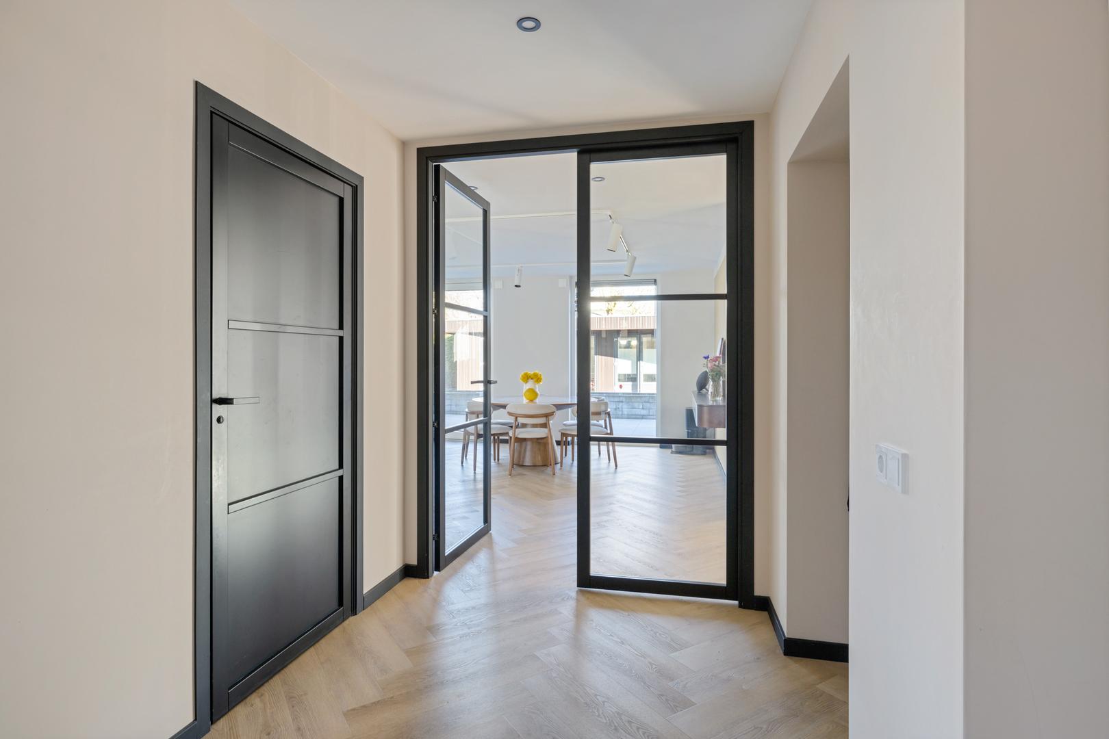 Via de entree komt u in een royale hal met garderoberuimte en een modern toilet. De ruime, lichte woonkamer beschikt over meerdere afzonderlijke zitplekken, maar vormt samen een bijna geheel open ruimte. De woonkeuken staat in directe verbinding met de woongedeelten.
