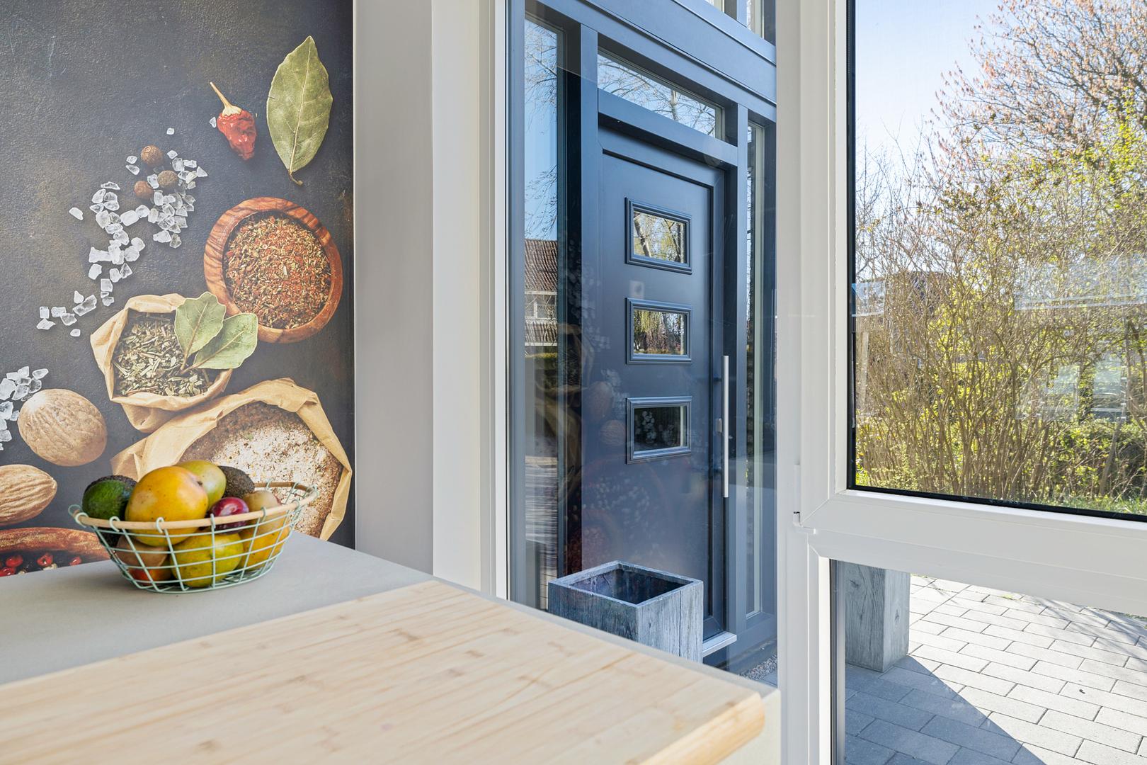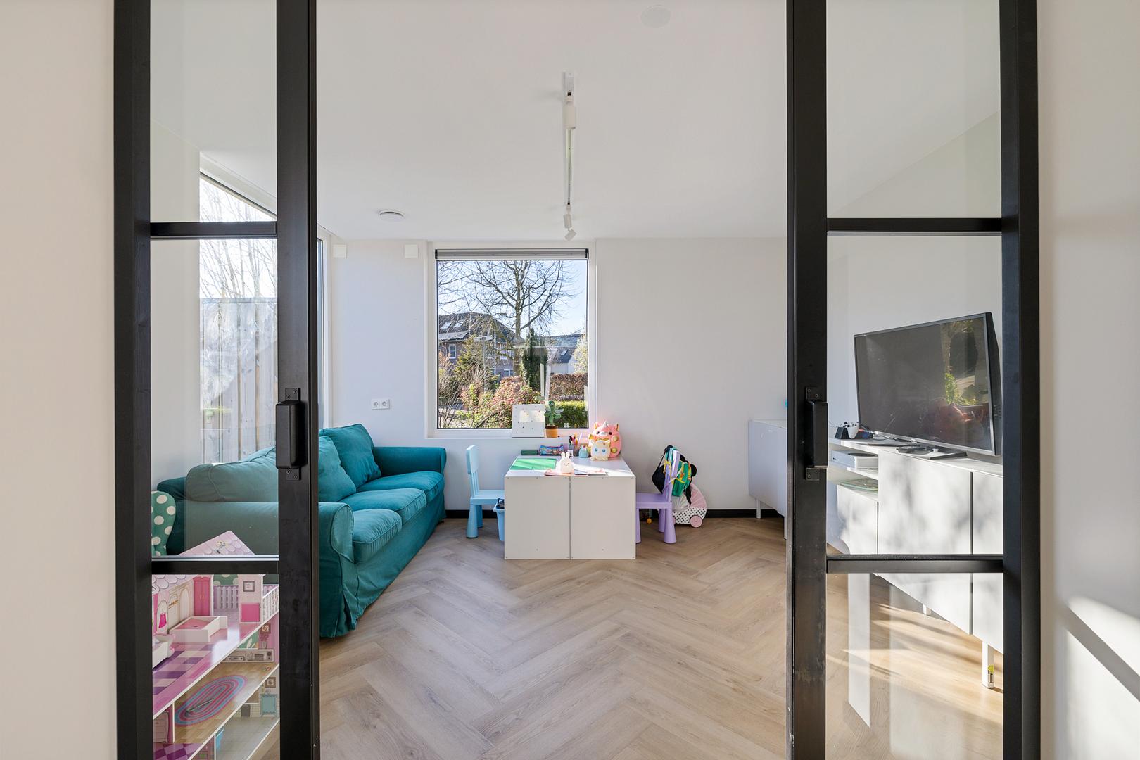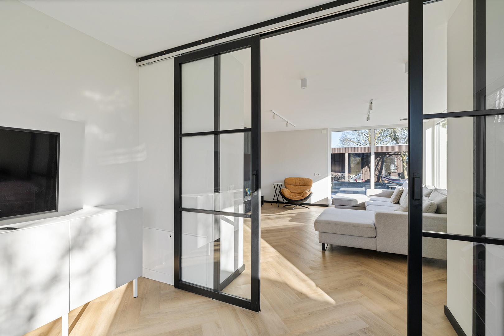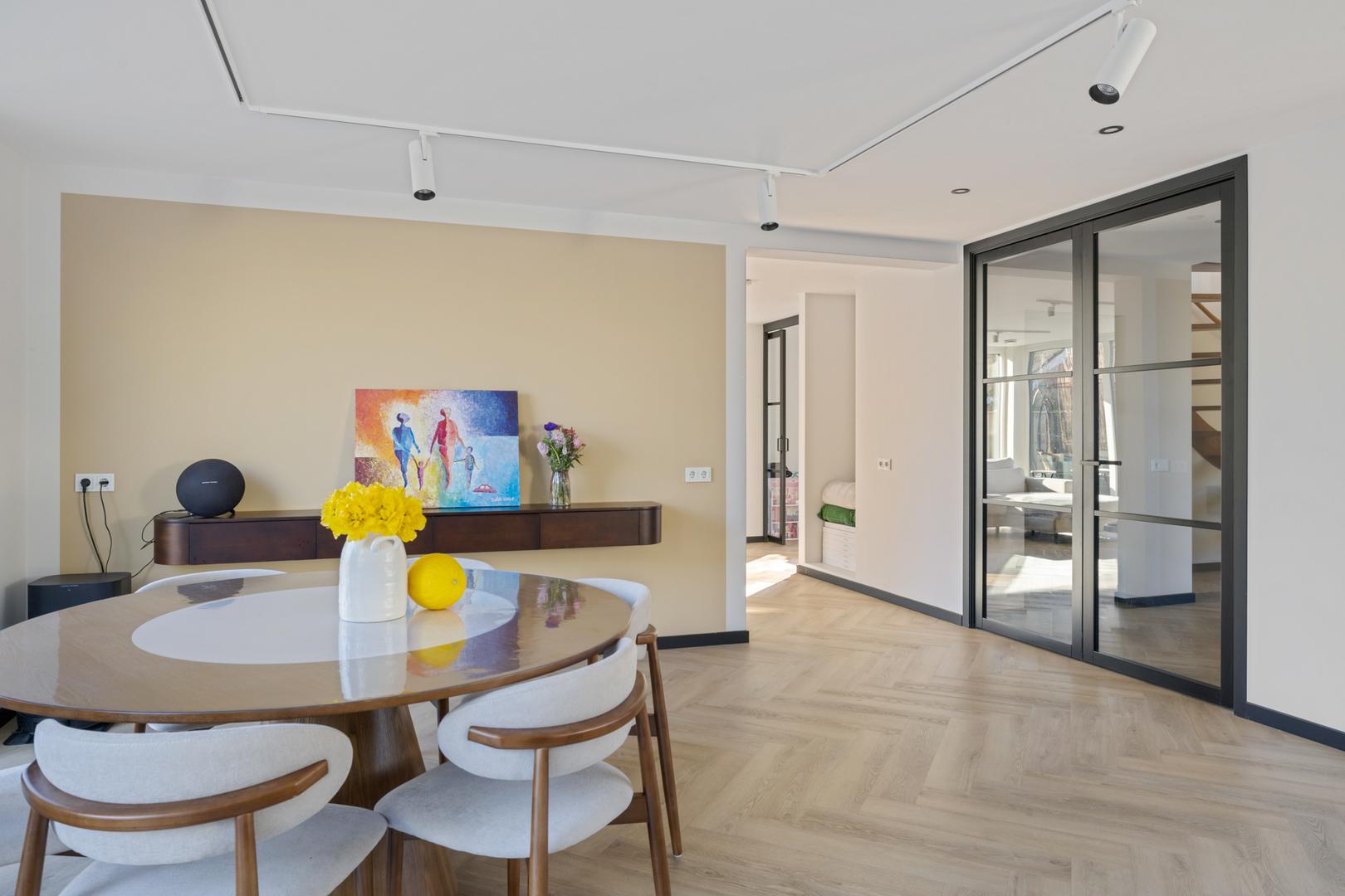 Via de entree komt u in een royale hal met garderoberuimte en een modern toilet. De ruime, lichte woonkamer beschikt over meerdere afzonderlijke zitplekken, maar vormt samen een bijna geheel open ruimte. De woonkeuken staat in directe verbinding met de woongedeelten.