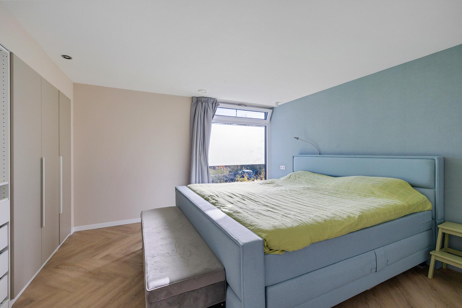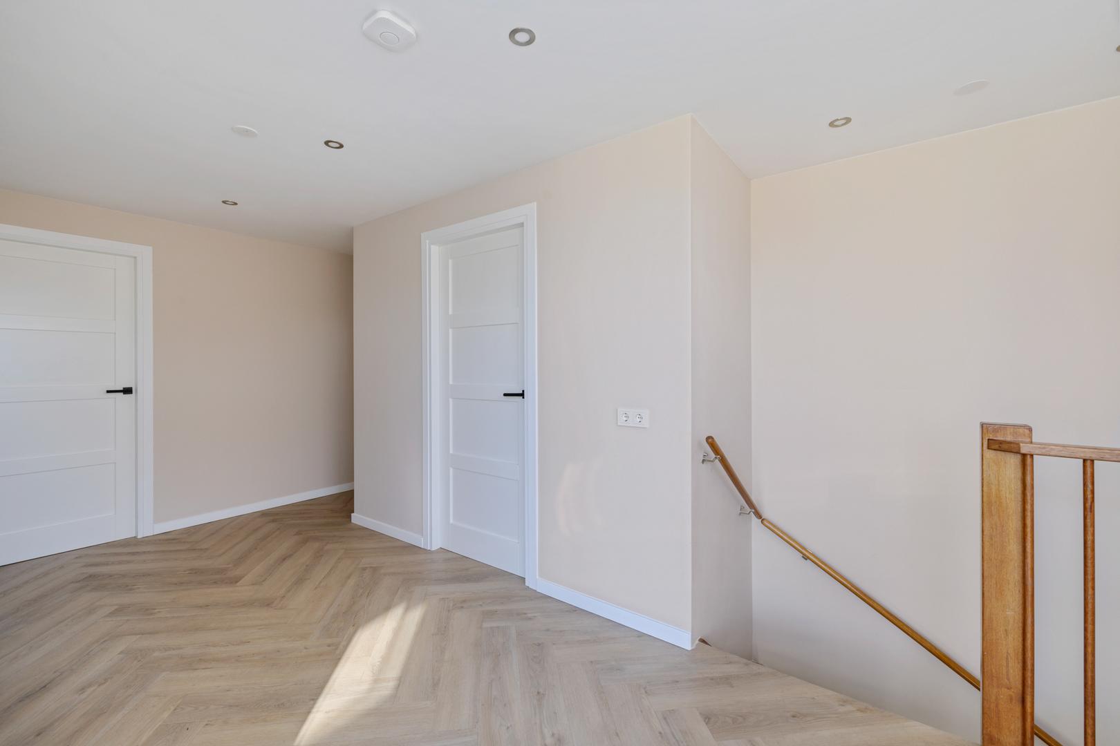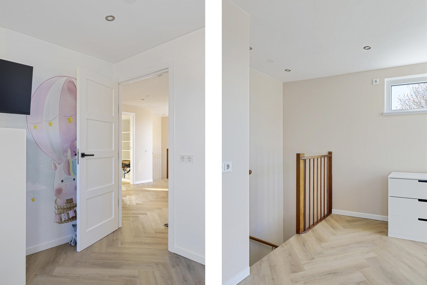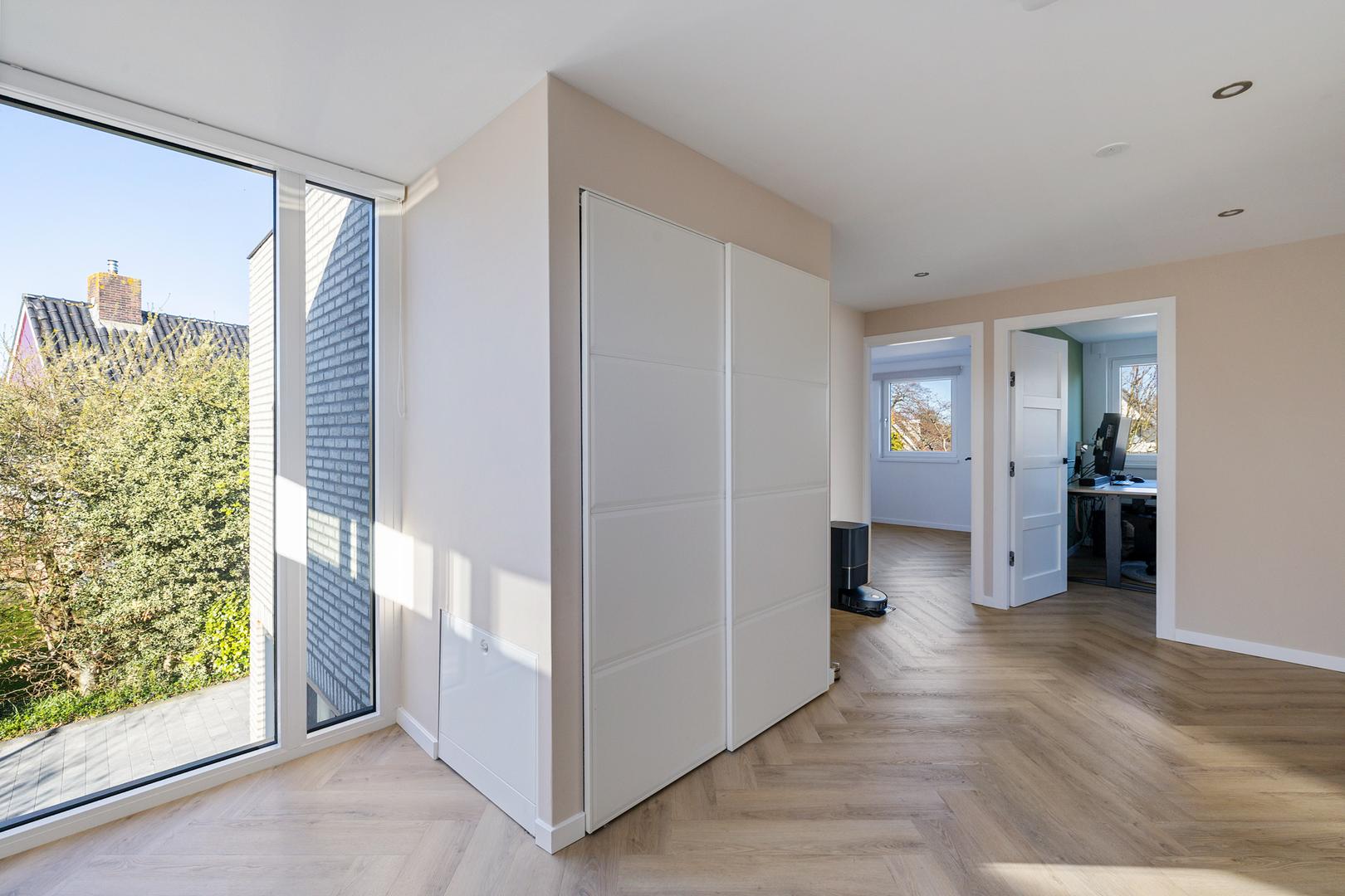 De ruime overloop geeft toegang tot vier volwaardige slaapkamers. De moderne badkamer is compleet uitgerust met een wastafelmeubel, ligbad, separate douche en een tweede toilet. Voor extra comfort zijn meerdere ramen voorzien van screens en rolluiken.