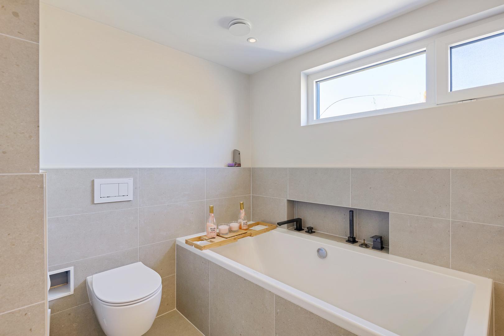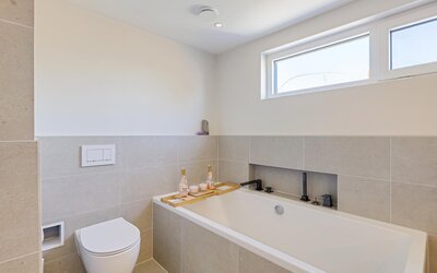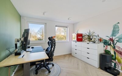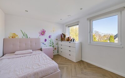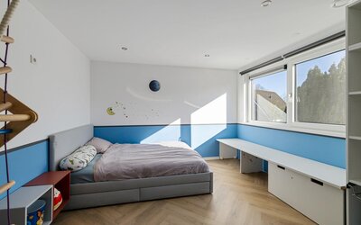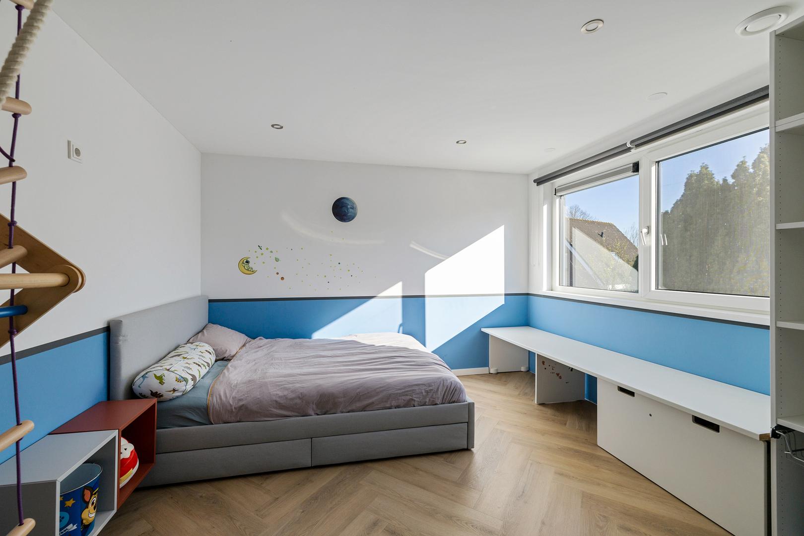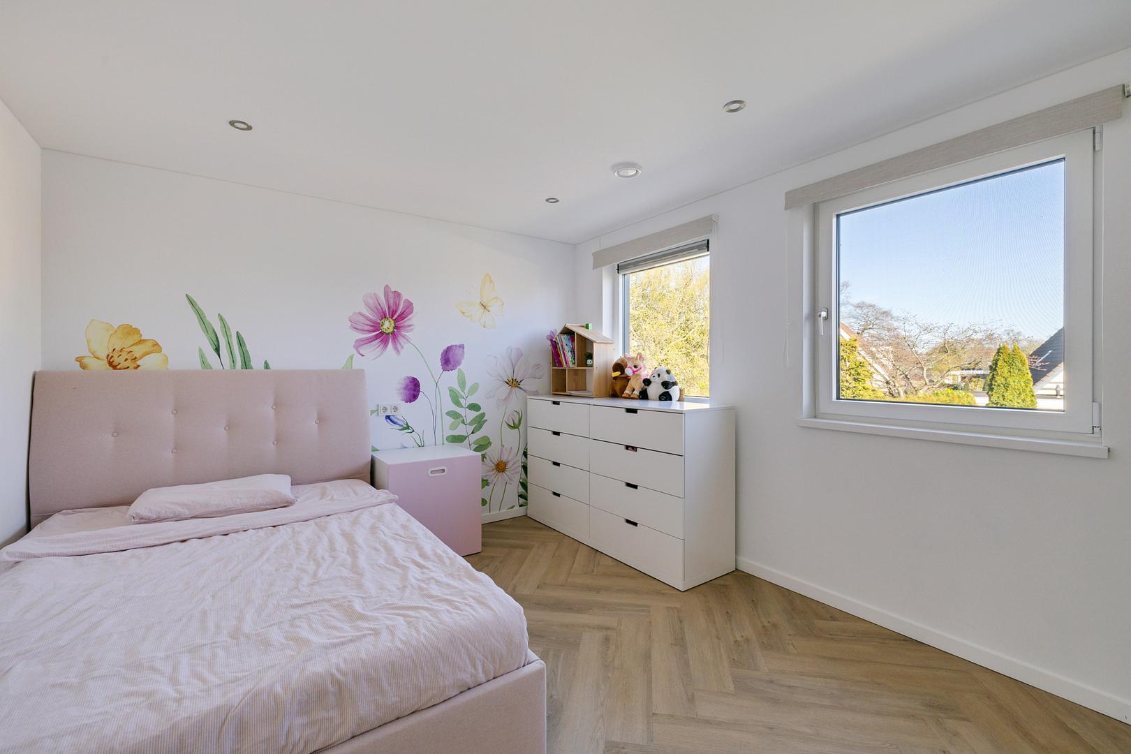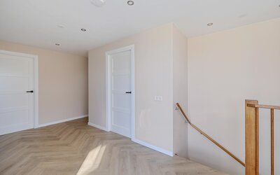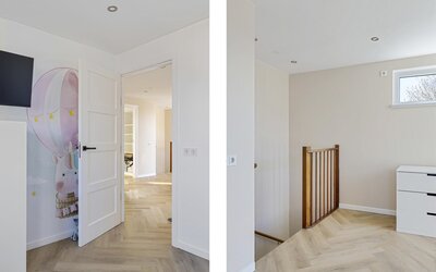 De ruime overloop geeft toegang tot vier volwaardige slaapkamers. De moderne badkamer is compleet uitgerust met een wastafelmeubel, ligbad, separate douche en een tweede toilet. Voor extra comfort zijn meerdere ramen voorzien van screens en rolluiken.
