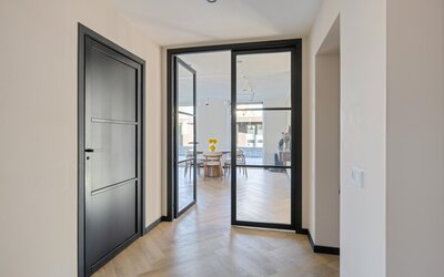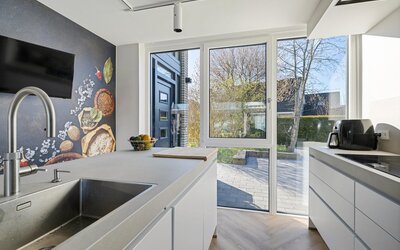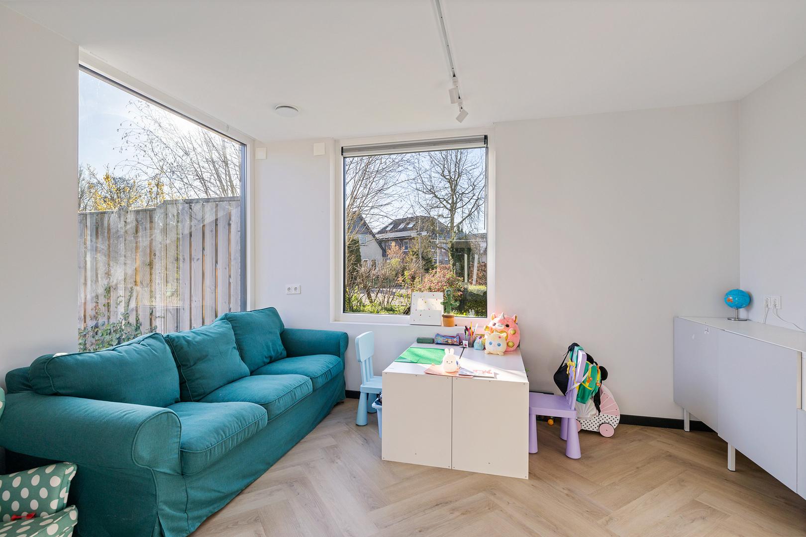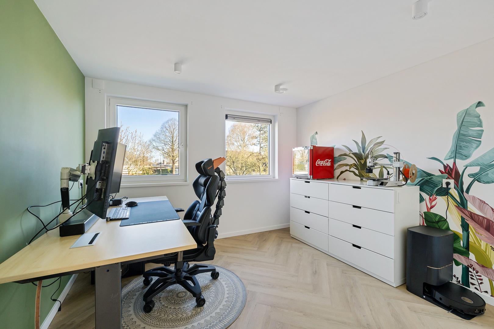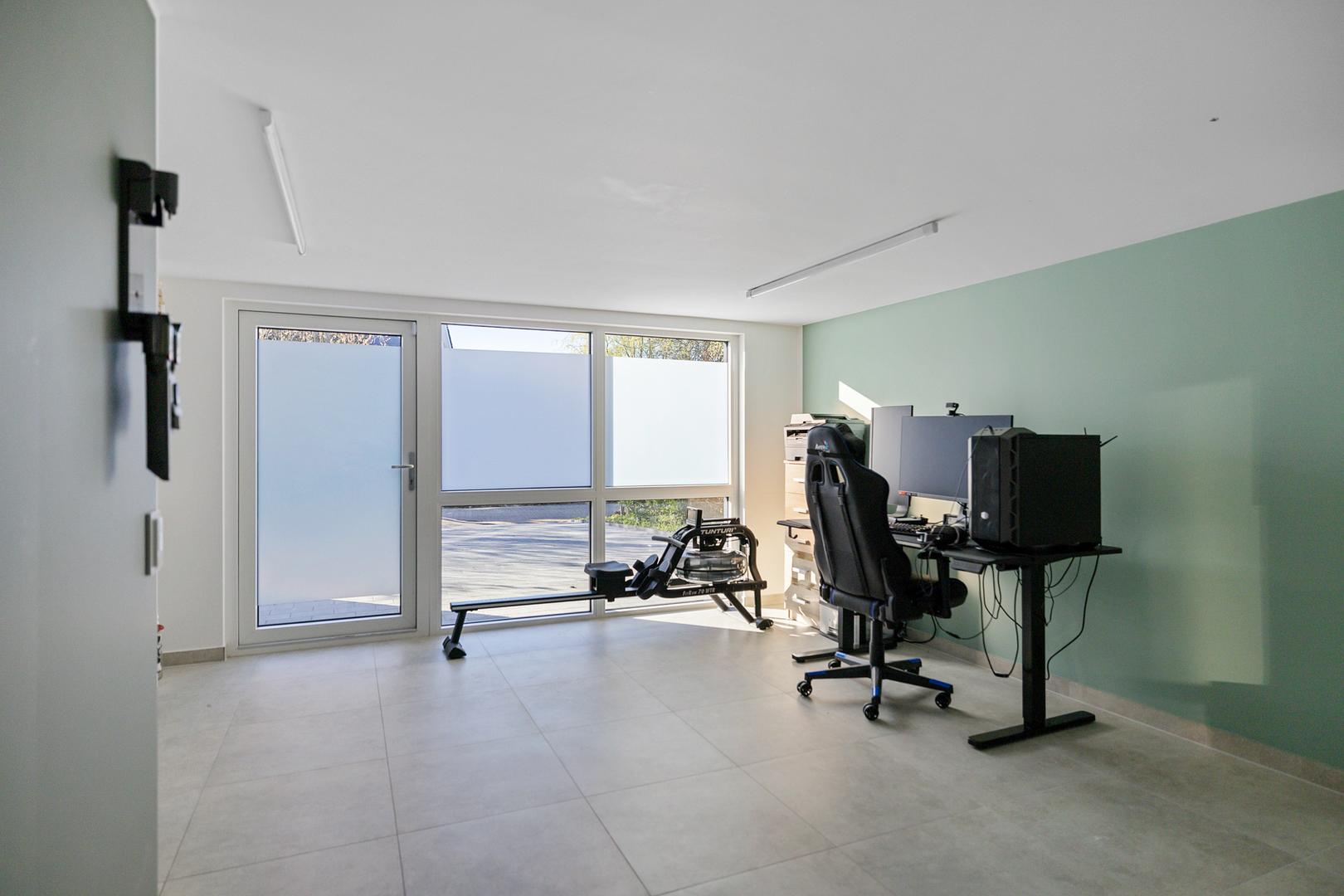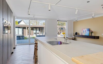 Met 220 m² aan woonoppervlak is er aan ruimte geen gebrek. De aangebouwde garage is vakkundig omgebouwd tot een lichte, moderne werk- en wasruimte. Elke kamer is voorzien van extra bekabeling voor verdere domotica-uitbreidingen en bij elk raam is stroomvoorbereiding getroffen voor de eenvoudige installatie van rolluiken.